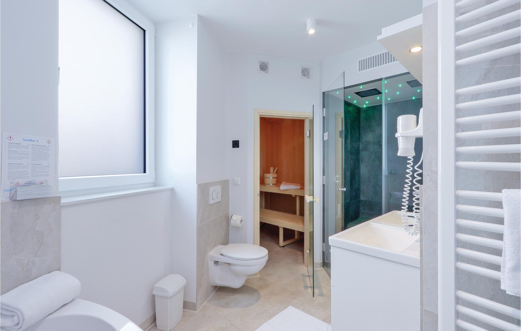 Die Wohnung ist stilvoll, hochwertig und modern eingerichtet. Ein besonderes Highlight ist das Bad, Ihr persönlicher kleiner Wellnessbereich mit Sauna und Dampfbad mit integrierter Doppelregendusche. Das Wohlfühlprogramm setzt sich im Wohnbereich fort, denn die flackernden Flammen des Bioethanolkamins tauchen den Raum in ein besonders gemütliches Licht. Das Sofa lässt sich mit wenigen Handgriffen in zwei bequeme Schlafmöglichkeiten umwandeln.