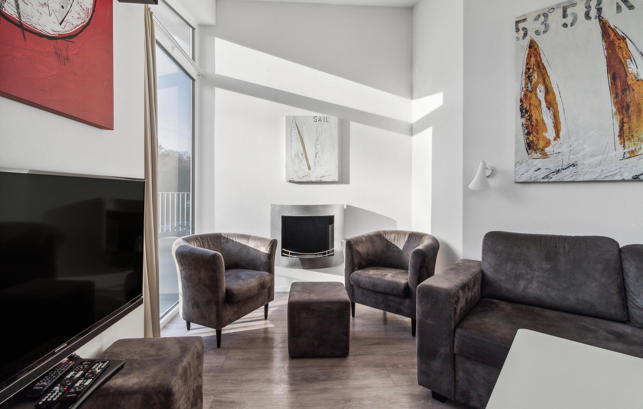 Die drei Schlafzimmer sind jeweils mit einem geräumigen Doppelbett ausgestattet. Als weitere Schlafmöglichkeit finden Sie im Wohnbereich das Schlafsofa für zwei weitere Personen. Eines der Schlafzimmer geht direkt in das Badezimmer über. Hier genießen Sie den einzigartigen Blick vom Whirlpool oder der Doppelregendusche aus. Der Bioethanolkamin taucht das Wohnzimmer in ein gemütliches Licht.