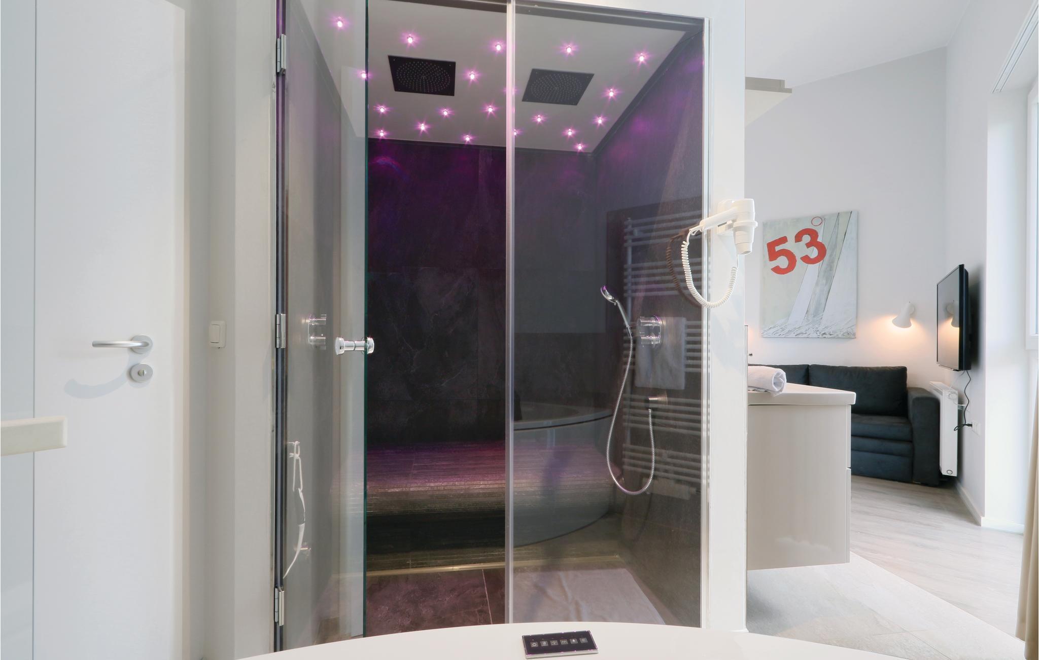 Das offene Badezimmer präsentiert sich Ihnen als privater Wellnessbereich mit Dampfbad und Doppelregendusche und ist über das Schlafzimmer zu erreichen. Entspannen Sie außerdem in der Sauna oder im Whirlpool.