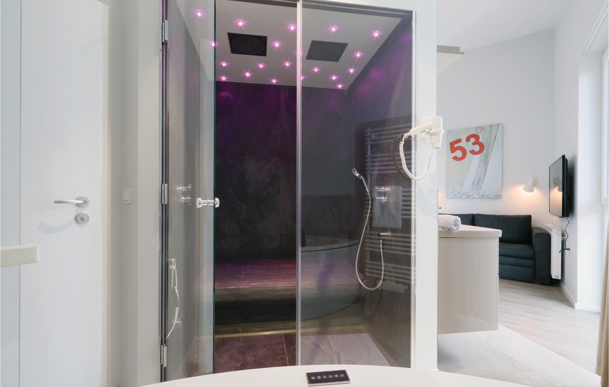 In der Küche finden Kaffeeliebhaber eine Nespresso-Maschine (Kapseln bitte selbst mitbringen), sowie Thermoskanne und Handfilter zum Selbstbrühen, falls Sie doch den klassischen Filterkaffee bevorzugen. Das offene Badezimmer präsentiert sich Ihnen als privater Wellnessbereich mit Dampfbad und Doppelregendusche und ist über das Schlafzimmer zu erreichen. Entspannen Sie außerdem in der Sauna oder im Whirlpool.