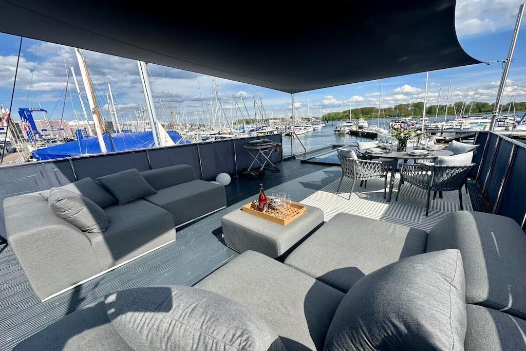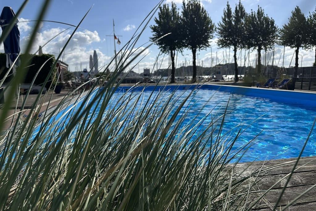 Modernes Hausboot in Travemünde mit Dachterrasse, Schwimmbecken und tollem Meerblick.