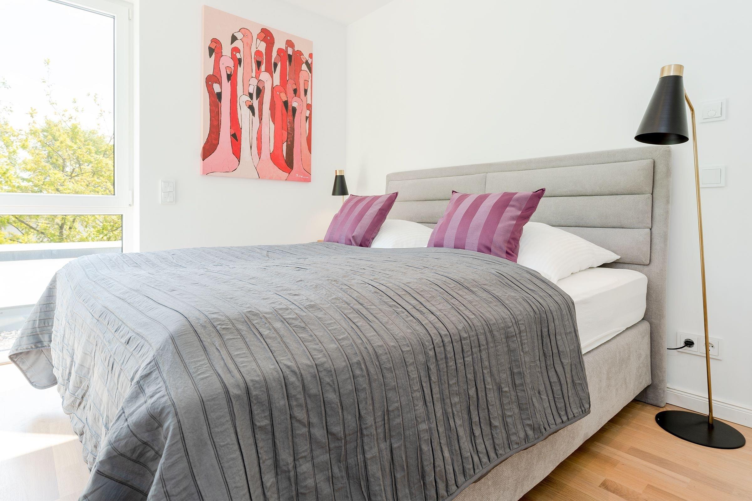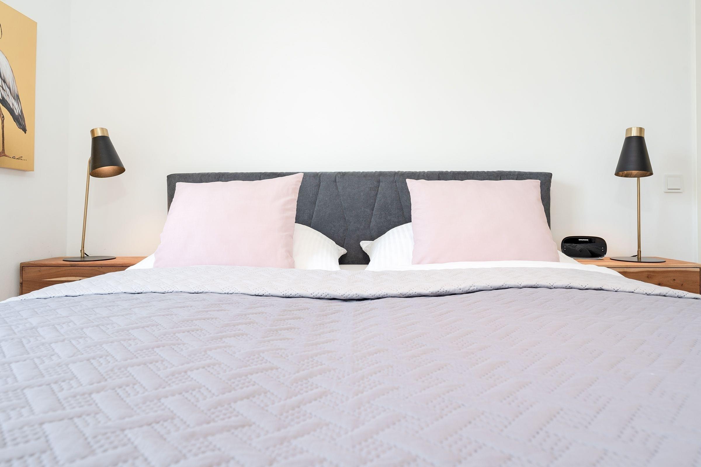Schlafzimmer 1: 1 Doppelboxspringbett (180x200 cm), Kleiderschrank, Verdunkelung (Rollläden), Bad en suite, Platz für Kinderreisebett vorhanden