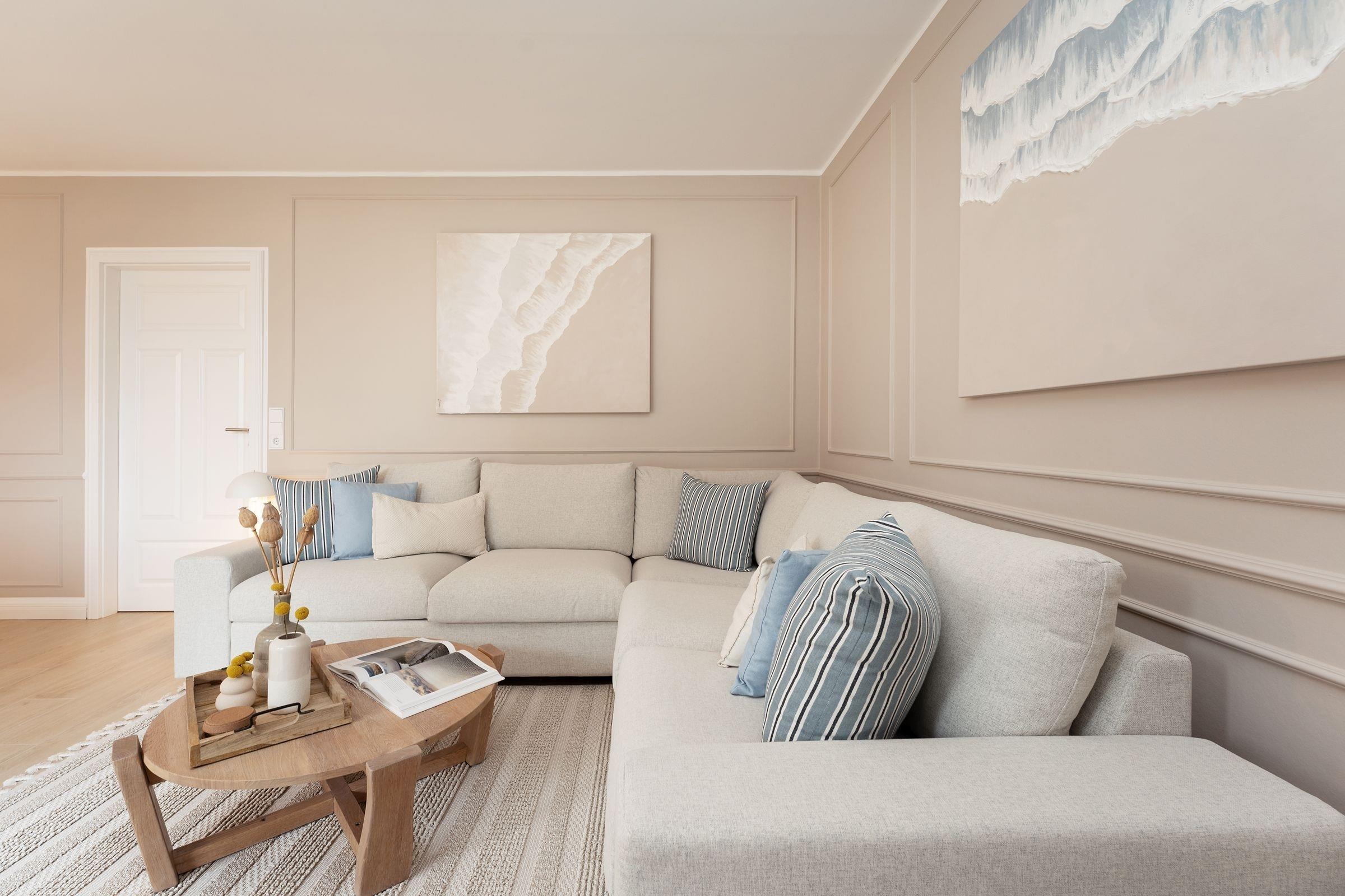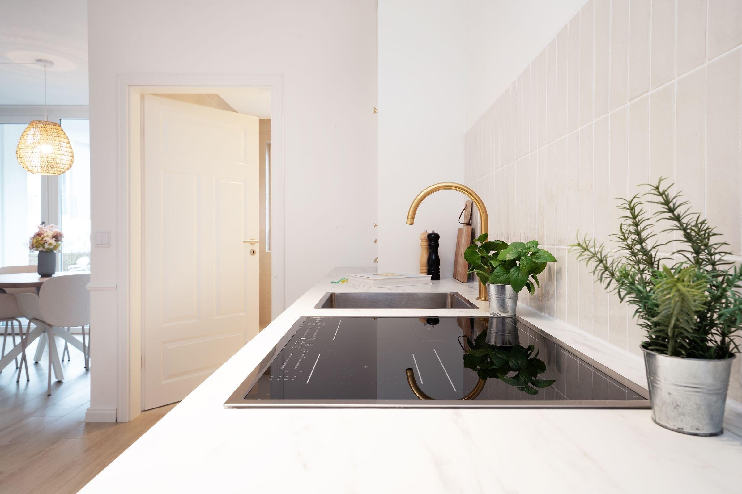Diese elegant eingerichtete Ferienwohnung auf dem Priwall besticht durch ihre geschmackvolle Einrichtung und lichtdurchflutete Räume. Der stilvolle Wohnbereich lädt mit einer gemütlichen Sitzecke und einem hochwertigen Flachbild-TV zu entspannten Abenden ein. Die großzügige Terrasse, ausgestattet mit Gartenmöbeln, bietet die perfekte Kulisse für gemeinsame Stunden an der frischen Ostseeluft. Die offene Küche im Eingangsbereich verbindet modernes Design mit Funktionalität. Ausgestattet mit einem Induktionsherd, Backofen, einem Kühlschrank mit Gefrierfach, Nespresso-Maschine, Wasserkocher und weiteren Annehmlichkeiten, ist sie perfekt für Kochliebhaber. Der angrenzende Essbereich fügt sich harmonisch in das Ambiente ein. Das Schlafzimmer überzeugt durch sein komfortables Doppelbett (2x 90x200 cm) und stilvolles Interieur. Ein bequemes Schlafsofa bietet im Wohnbereich zwei zusätzliche Schlafmöglichkeiten (ca. 140x200 cm). Das tageslichthelle Badezimmer ist modern gestaltet und verfügt über eine bodengleiche Dusche sowie einen beheizbaren Handtuchhalter.