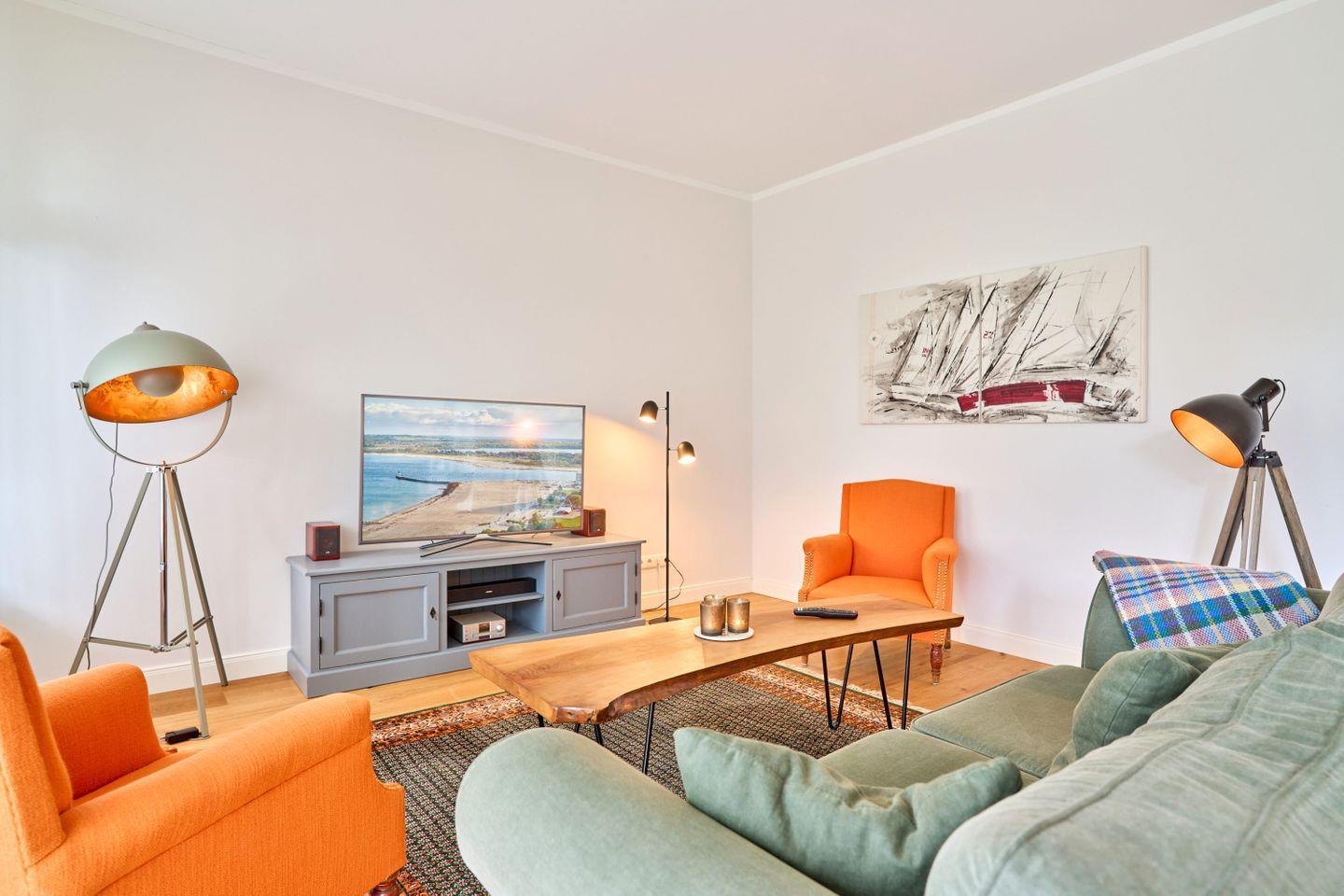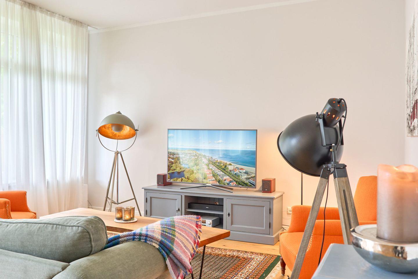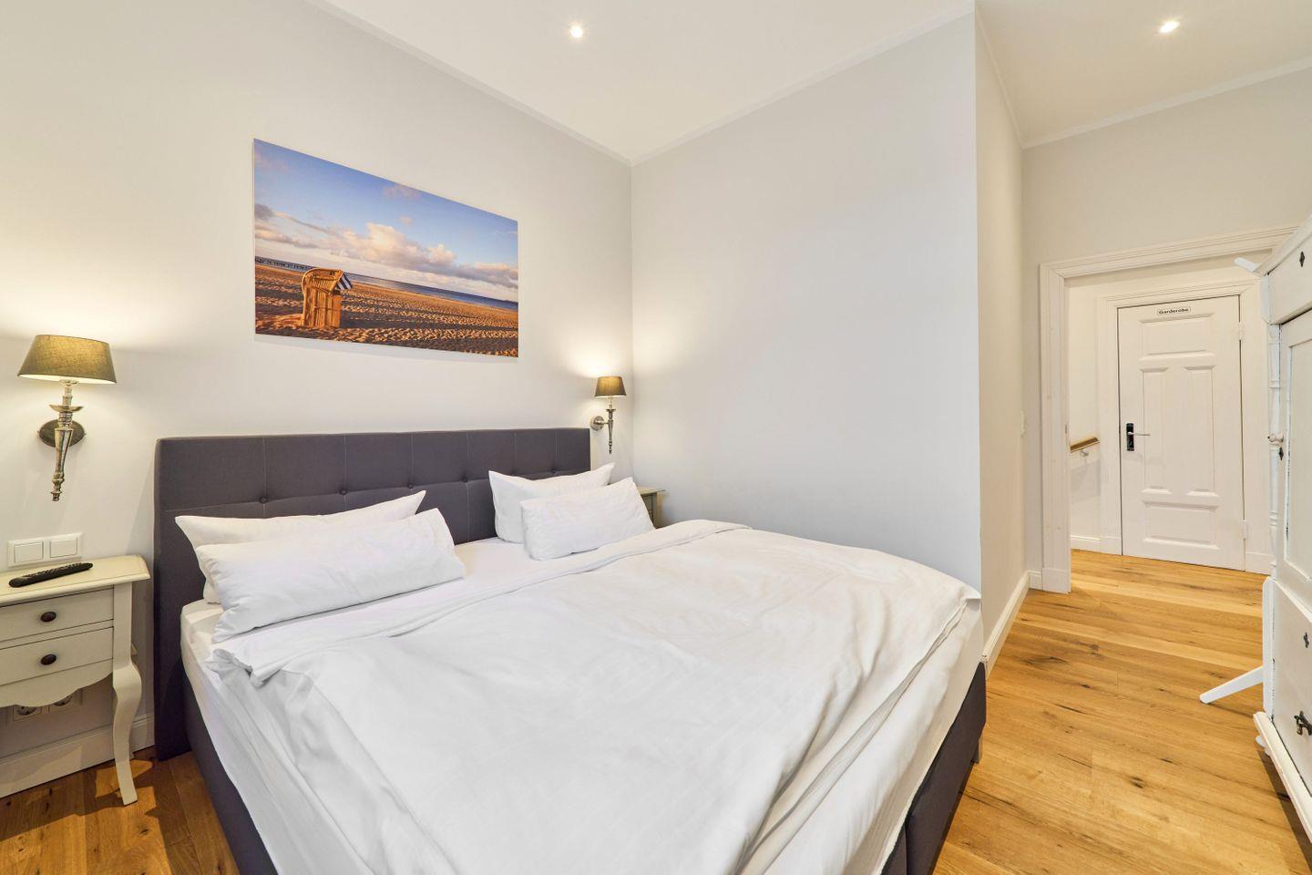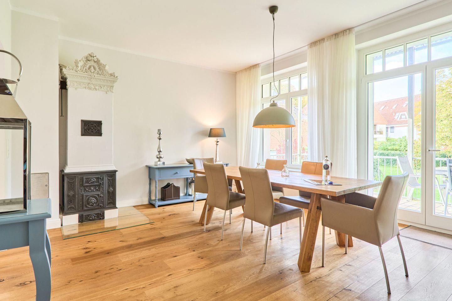 Villa Daheim Travemünde – Luxus pur in der Kaiserallee. Auf 105 m² bietet die Ferienwohnung Villa Daheim alles, was man sich für einen entspannten Urlaub an der Ostsee wünscht. Die luxuriöse Ferienwohnung liegt in der ruhigen zweiten Reihe an der Kaiserallee, nur 50 m vom Ostseestrand entfernt. Das Zentrum von Travemünde ist in etwa 15 Gehminuten über die Promenade erreichbar. Die Wohnung befindet sich in einer stilvollen Bäderstil-Villa, die kürzlich kernsaniert und modern eingerichtet wurde. Mit drei Zimmern, zwei Schlafzimmern, einer großzügigen Veranda und einer voll ausgestatteten Küche bietet die Wohnung Platz für bis zu vier Gäste. Große bodentiefe Fenster im Wohnzimmer sorgen für eine helle Atmosphäre und der Zugang zur sonnigen, südlich ausgerichteten Veranda mit Blick ins Grüne lädt zum Entspannen ein. Ein privater Strandkorb auf der Veranda sowie der Zugang zum Gemeinschaftsgarten sorgen für zusätzliche Erholung. In beiden Schlafzimmern stehen komfortable Boxspring-Doppelbetten und ausreichend Stauraum in den Kleiderschränken zur Verfügung. Das Badezimmer bietet eine Badewanne, Dusche und WC. Eine Waschmaschine zur freien Nutzung befindet sich im Waschkeller. Für Unterhaltung sorgen ein großer LED-TV mit Kabelanschluss im Wohnzimmer, ein weiterer TV im Schlafzimmer sowie eine Stereoanlage mit Radio und CD-Funktion. Die geschmackvolle und moderne Einrichtung auf 105 m² lässt keine Wünsche offen. Für Ihren Komfort ist ein privater Stellplatz direkt vor dem Haus vorhanden, und Ihre Fahrräder können sicher und trocken im eigenen Fahrradschuppen untergebracht werden. Villa Daheim in Travemünde bietet Luxus, modernes Ambiente und Altbaucharme in strandnaher Lage an der Kaiserallee und ist die perfekte Unterkunft für einen unvergesslichen Ostseeurlaub.