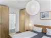 Eine abgetrennte Kajüte mit einem Hochbett für zwei Kinder sorgt dafür, dass die Schlafcouch im Wohnbereich nicht mehr umgebaut werden muss und das Wohnzimmer vollständig nutzbar bleibt. Der Balkon mit Blick in den Vorgarten lädt zum Entspannen ein, und die ruhige Lage sowie die Nähe zum Strand machen das Apartment besonders attraktiv.