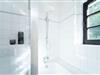 Im Badezimmer findest Du eine Badewanne mit Duschabtrennung vor. Das Bad ist gefliest und das eingebaute Regal bietet viel Stauraum.