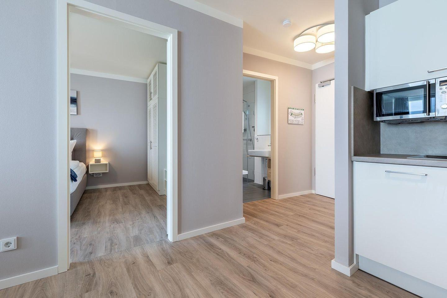 Zur Ausstattung der Ferienanlage gehören außerdem eine Rezeption mit Lobby und Kamin-Lounge, eine Tiefgarage mit inkludiertem Stellplatz (max. Höhe 2 m) sowie gemeinschaftlich nutzbare Waschräume auf jeder Etage. Zwei Aufzüge sorgen für barrierefreien Zugang zu allen Apartments. Fahrräder lassen sich sicher im abschließbaren Kellerraum unterbringen, und vor dem Haus steht eine öffentliche Ladestation für E-Autos zur Verfügung, die gegen Gebühr genutzt werden kann.