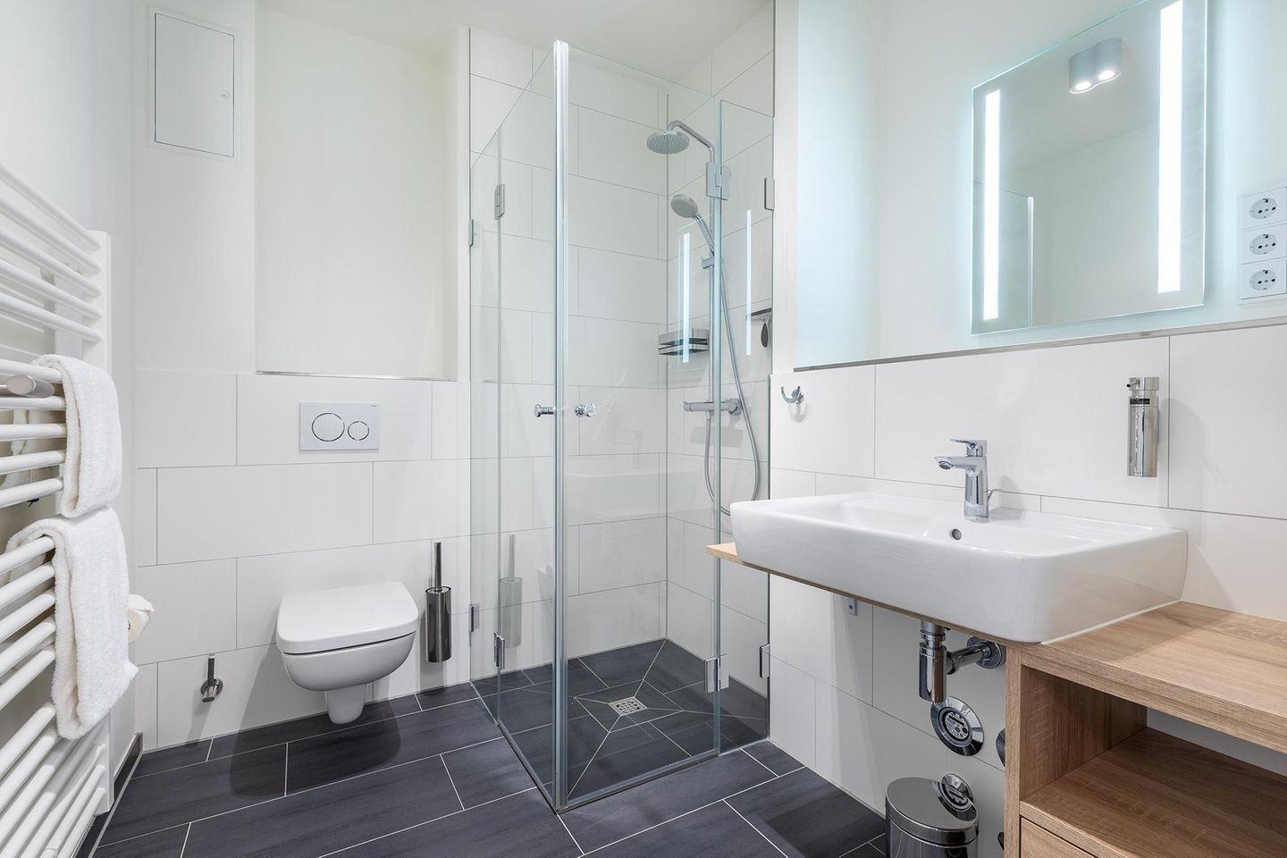 Ein besonderes Highlight ist die großzügige Wellnesslandschaft: Finnische Sauna, Biosauna, Dampfbad, Fußbäder, Erlebnisduschen, Eisbrunnen sowie Ruhezonen mit Kamin laden zum Entspannen ein. Während der Öffnungszeiten steht Ihnen der Spa-Bereich kostenfrei zur Verfügung. Wer keinen Bademantel dabei hat, kann sich diesen ebenso wie Saunatücher bequem gegen eine geringe Gebühr leihen. Ein Aufzug verbindet den Wellnessbereich mit allen Etagen, sodass Sie bequem zu Ihrer Wohnung gelangen können.