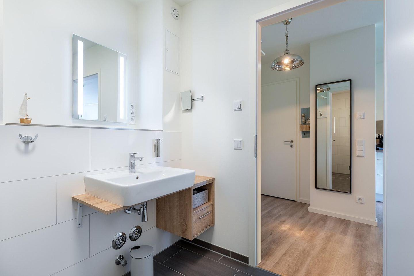 Das Badezimmer verfügt über eine bodengleiche Dusche, Waschbecken, Spiegel, Kosmetikspiegel, WC und Haartrockner. Fußbodenheizung sorgt im Bad und Wohnbereich für angenehme Wärme. WLAN und Internetzugang sind ebenfalls vorhanden.