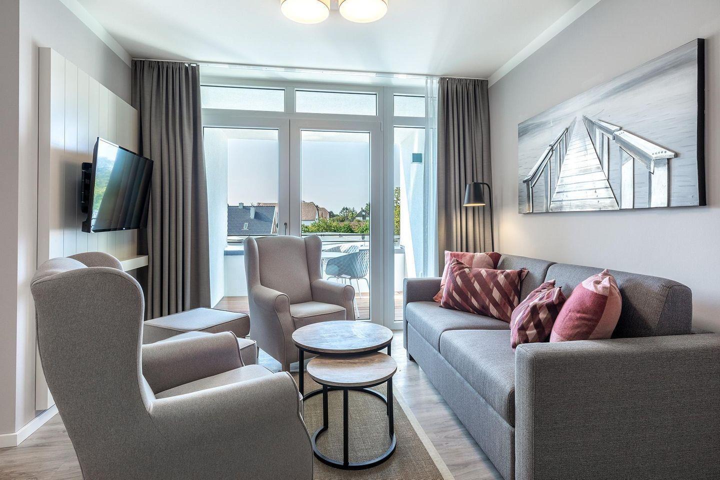 Das Apartment besticht durch ein helles, freundliches Ambiente, bodentiefe Fenster mit Sonnenschutzverglasung und eine komfortable Fußbodenheizung. Für entspannte Urlaubsmomente steht Ihnen ein behaglicher Wohn-Essbereich zur Verfügung – inklusive gemütlicher Schlafcouch und SMART-TV.