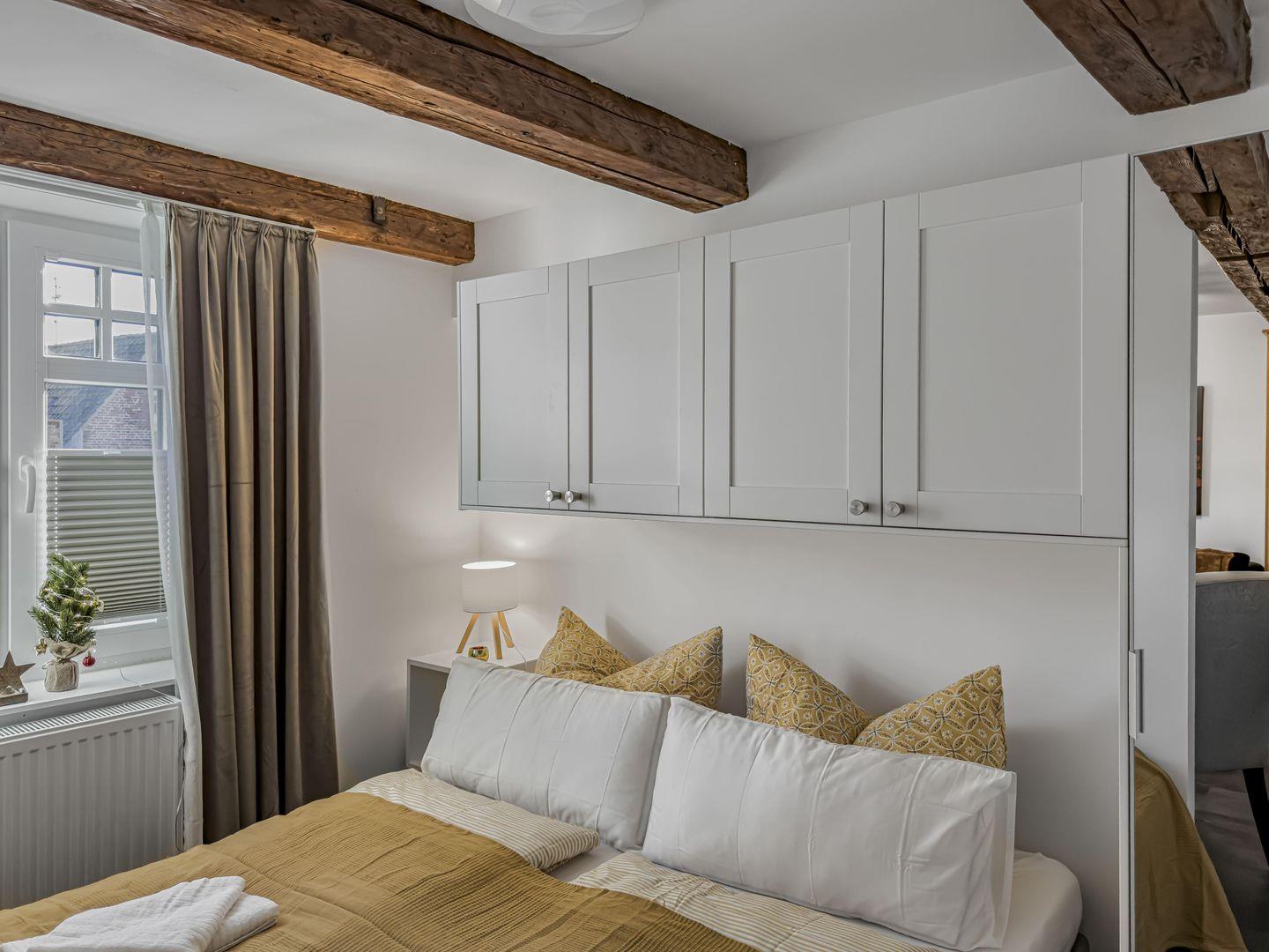 Dieses moderne 2-Zimmer-Apartment im 2. Obergeschoss bietet auf ca. 26 m² alles für einen komfortablen Aufenthalt. Das Schlafzimmer ist mit einem Doppelbett (1,60 m) ausgestattet, im Wohnbereich finden Sie ein Sofa und einen TV. Die Einbauküche verfügt über ein Induktions-Kochfeld, Backofen und Geschirrspüler – ideal für die Zubereitung eigener Mahlzeiten. Das Duschbad rundet das Apartment ab. Eine Waschküche mit Münzbetrieb steht ebenfalls zur Verfügung. Dank der zentralen Lage sind Einkaufsmöglichkeiten, Restaurants und Geschäfte nur wenige Schritte entfernt, und eine Busanbindung befindet sich direkt vor der Tür.