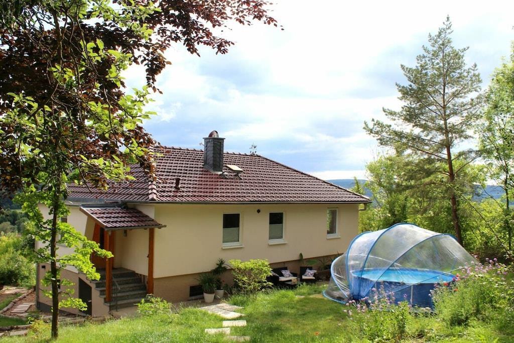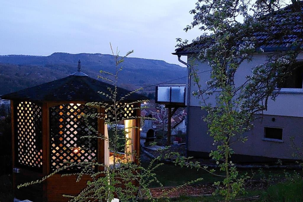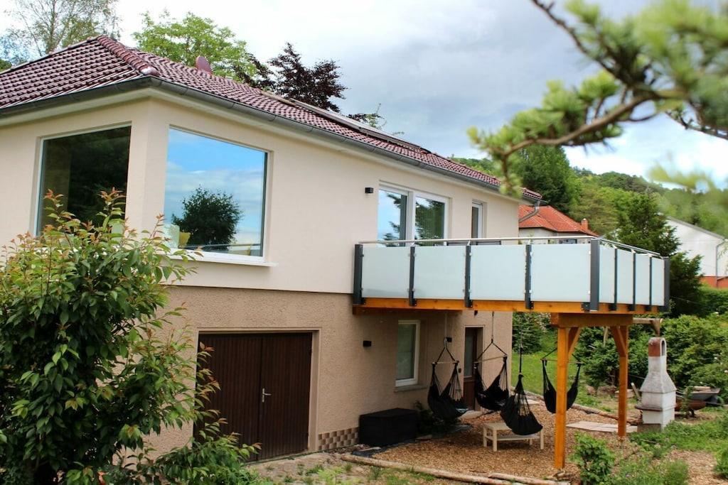 Erleben Sie Entspannung im 2022 sanierten Ferienhaus in Treffurt mit herrlichem Ausblick auf Altstadt und Werratal. Balkon, Panoramafenster, Wohn-/Esszimmer mit Küchenzeile. Platz für bis zu 8 Personen: Boxspringbett im ersten Schlafzimmer, flexibles Doppelbett im zweiten. Geräumiges Bad mit ebenerdiger Dusche und Badewanne, separate Gästetoilette. Optional buchbare Sauna für 4 Erwachsene. Privater Pool im Sommer. Garten mit Grillplatz, Pavillon und Teich. Eingezäuntes Grundstück, ideal für Vierbeiner.