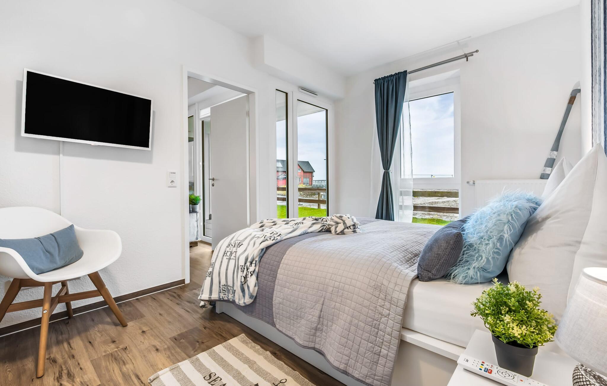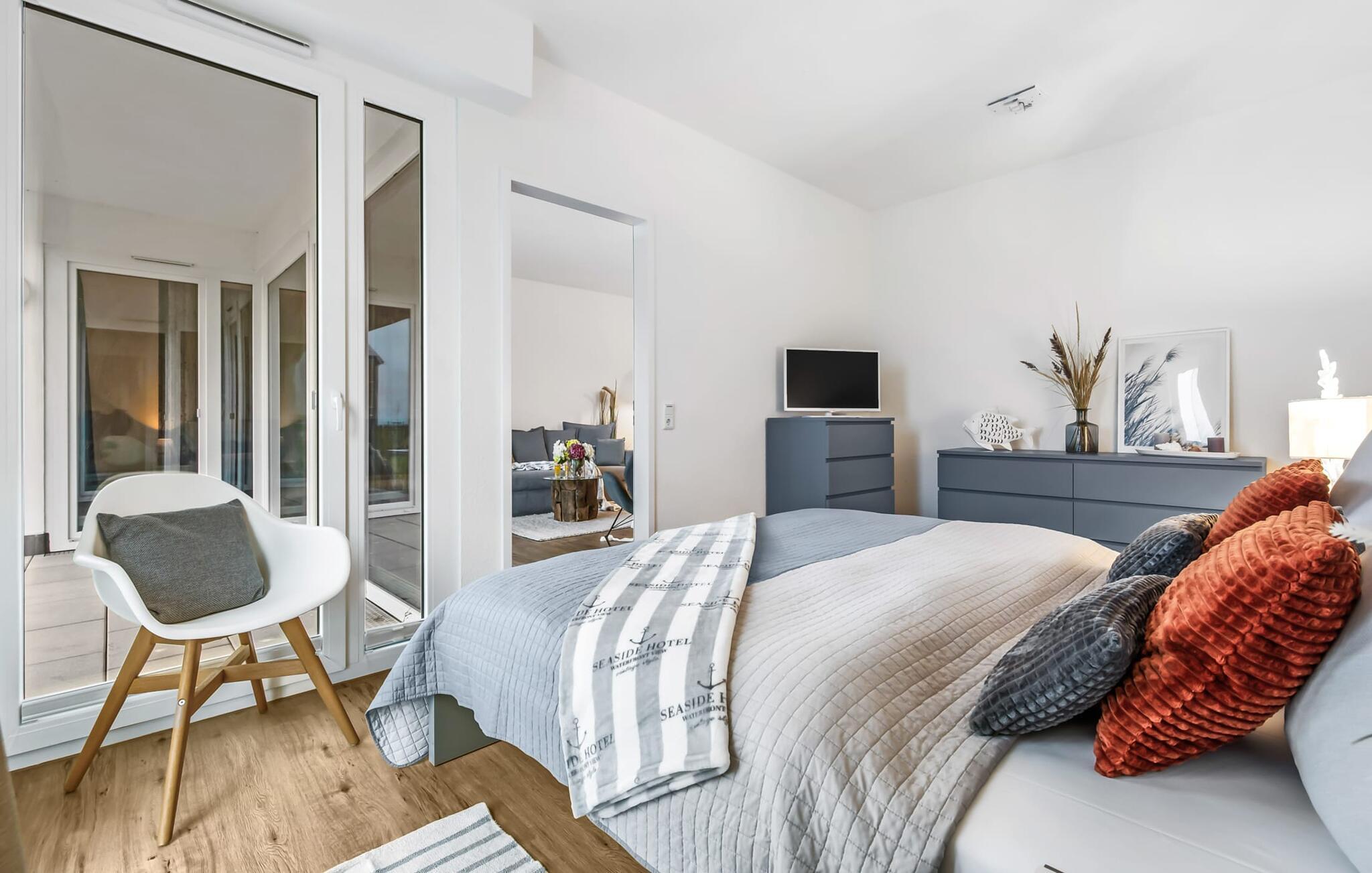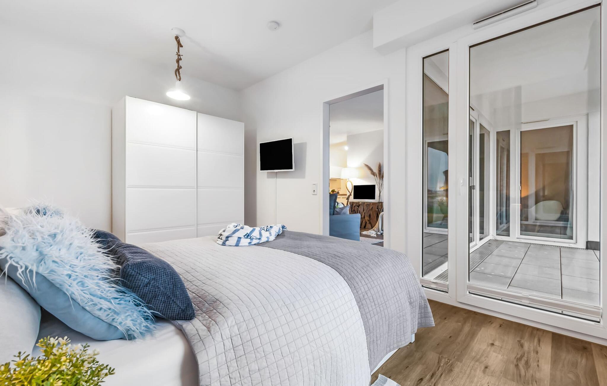 Die beiden Schlafzimmer sind mit hochwertigen Doppelbetten und Fernsehern ausgestattet und bieten direkten Zugang zur Terrasse. Das geräumige Badezimmer verwöhnt Sie mit einer bodengleichen Dusche und perfekter Ausstattung.
