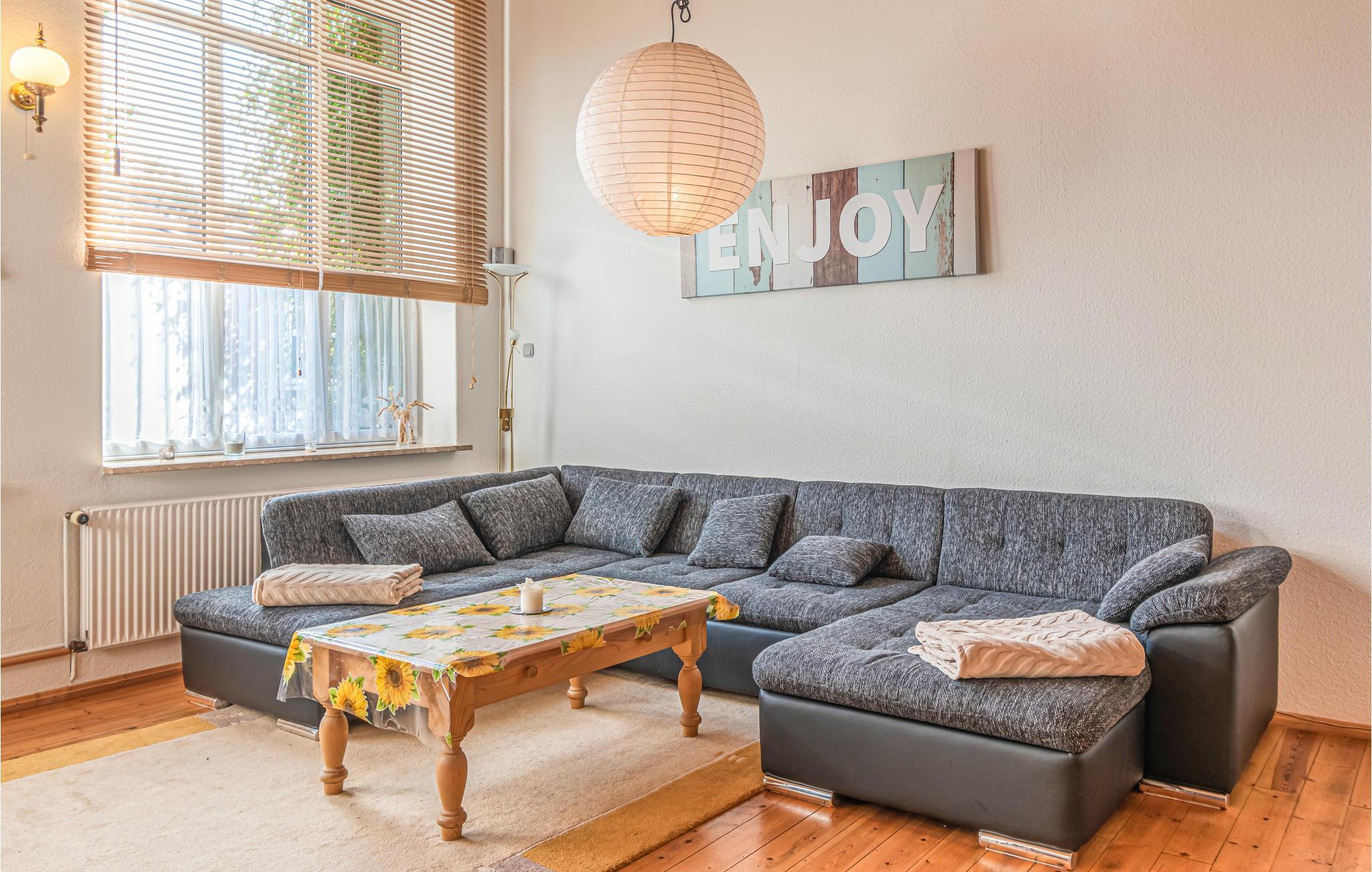 Sie ist für vier Personen und ein Kleinkind geeignet. Das gemütlich eingerichtete Wohnzimmer ist mit einer großen Wohnlandschaft, einer großen Essecke, einem Kaminofen, einem großen SAT-TV, einer Bluetooth-Anlage und einer Playstation 3 ausgestattet. Für die Kinder gibt zusätzlich ein Spielteppich mit Spielzeug der bei Bedarf hingelegt werden kann.