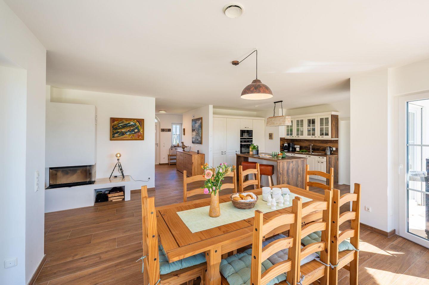 Die Villa verfügt über drei geräumige, helle Schlafzimmer, die nach einem aktiven Tag in der Natur zum Entspannen einladen. Zwei moderne Badezimmer (eines davon ensuite) sowie ein zusätzliches Gäste-WC sorgen für hohen Komfort. Die offene, voll ausgestattete Küche lässt keine Wünsche offen. Mit Cerankochfeld, Backofen, Spülmaschine, Mikrowelle und allen notwendigen Küchenutensilien ausgestattet, bietet sie alles für kulinarische Erlebnisse – vom schnellen Frühstück bis zum gemütlichen Abendessen. Eine Fußbodenheizung sorgt für ein angenehmes Wohnklima auch in der kälteren Jahreszeit. Der großzügige Wohnbereich mit Kamin, einer gemütlichen Sofaecke und einem großen Esstisch lädt zu geselligen Stunden ein. Ob ein spannender Film auf einem der vier Fernseher, eine Spielrunde mit der Familie oder konzentriertes Arbeiten am vorhandenen Schreibtisch – hier findet jeder sein Plätzchen. Ein Babyreisebett (ohne Bettzeug) und ein Hochstuhl stehen zur Verfügung, sodass auch die Kleinsten bestens versorgt sind.