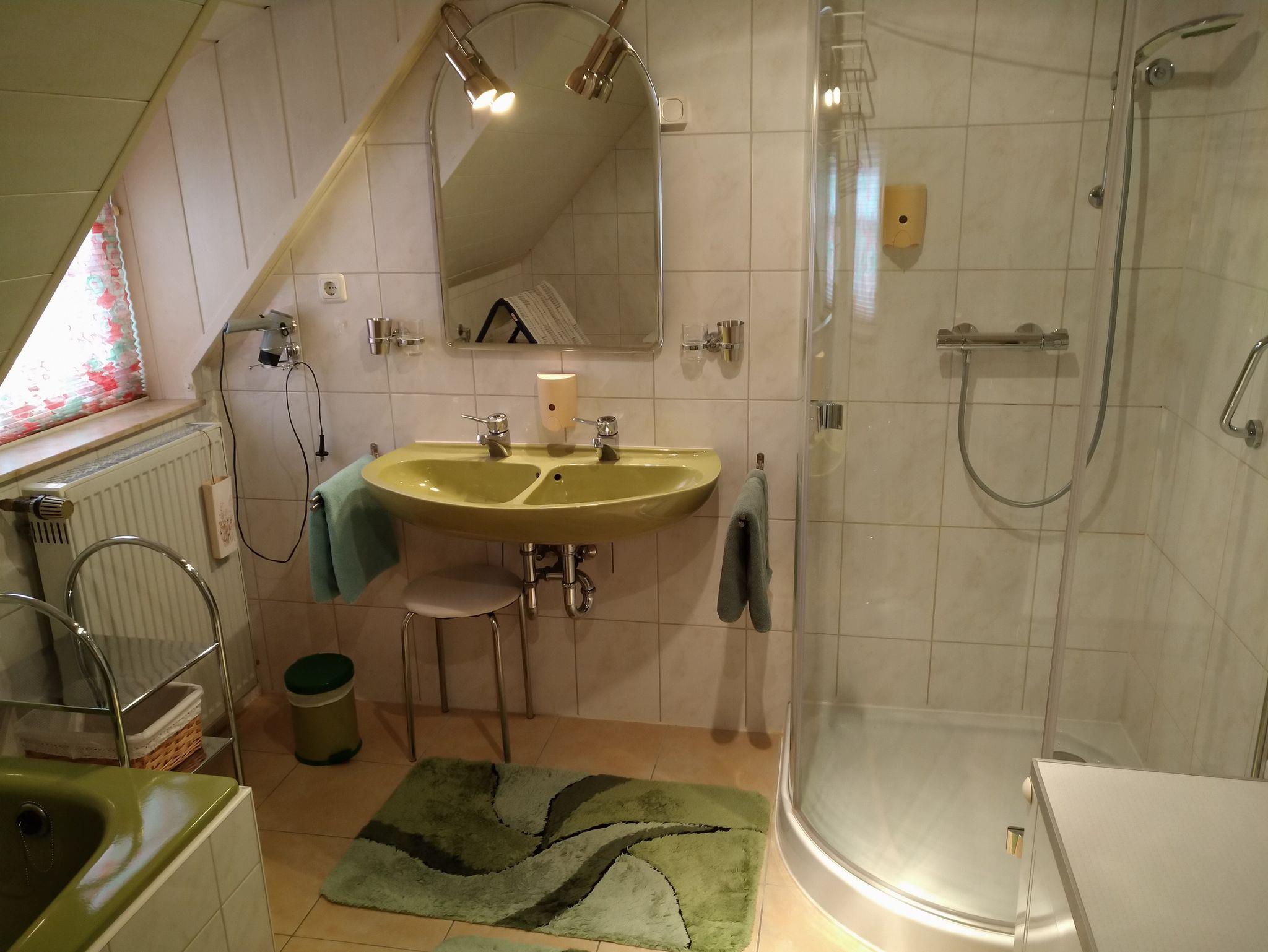 Das Bad verfügt neben einem Doppelwaschbecken , einer Glasduschkabine und dem WC auch über eine Badewanne. Ein Haarfön ist vorhanden.