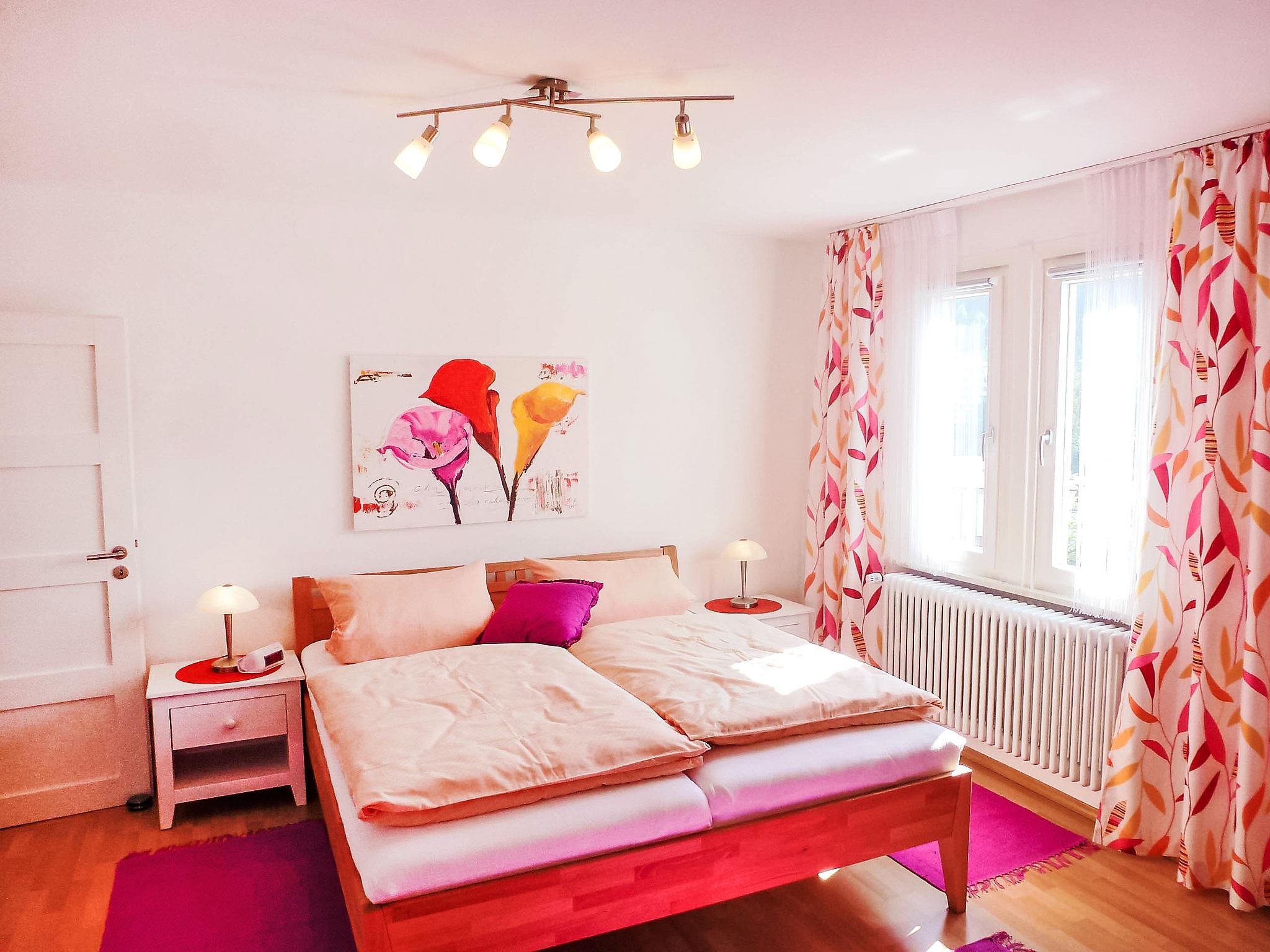 2-Zimmer-Wohnung 65 m2, im Obergeschoss. Hell, teilweise abgeschrägt, sehr gemütlich eingerichtet: grosses Wohn-/Schlafzimmer mit 1 Doppeldiwanbett (140 cm, Länge 220 cm), Kabel-TV (Flachbildschirm), Radio. Ausgang zur Terrasse. 1 Doppelzimmer mit 1 Doppelbett (2 x 90 cm, Länge 200 cm). Grosse Wohnküche (Backofen, Geschirrspüler, 4 Glaskeramikplatten, Mikrowelle, elektrische Kaffeemaschine) mit Esstisch. Ausgang zur Terrasse. Bad/WC. Schöne Sicht auf das Tal und das Städtchen. Zur Verfügung: Haartrockner. Internet (WLAN, extra). Bitte beachten: Nichtraucher-Unterkunft. Maximal 1 Haustier/Hund erlaubt. Es sind nur Hunde als Haustiere erlaubt. Die Terrasse ist eine grosszügige Dachterrasse.