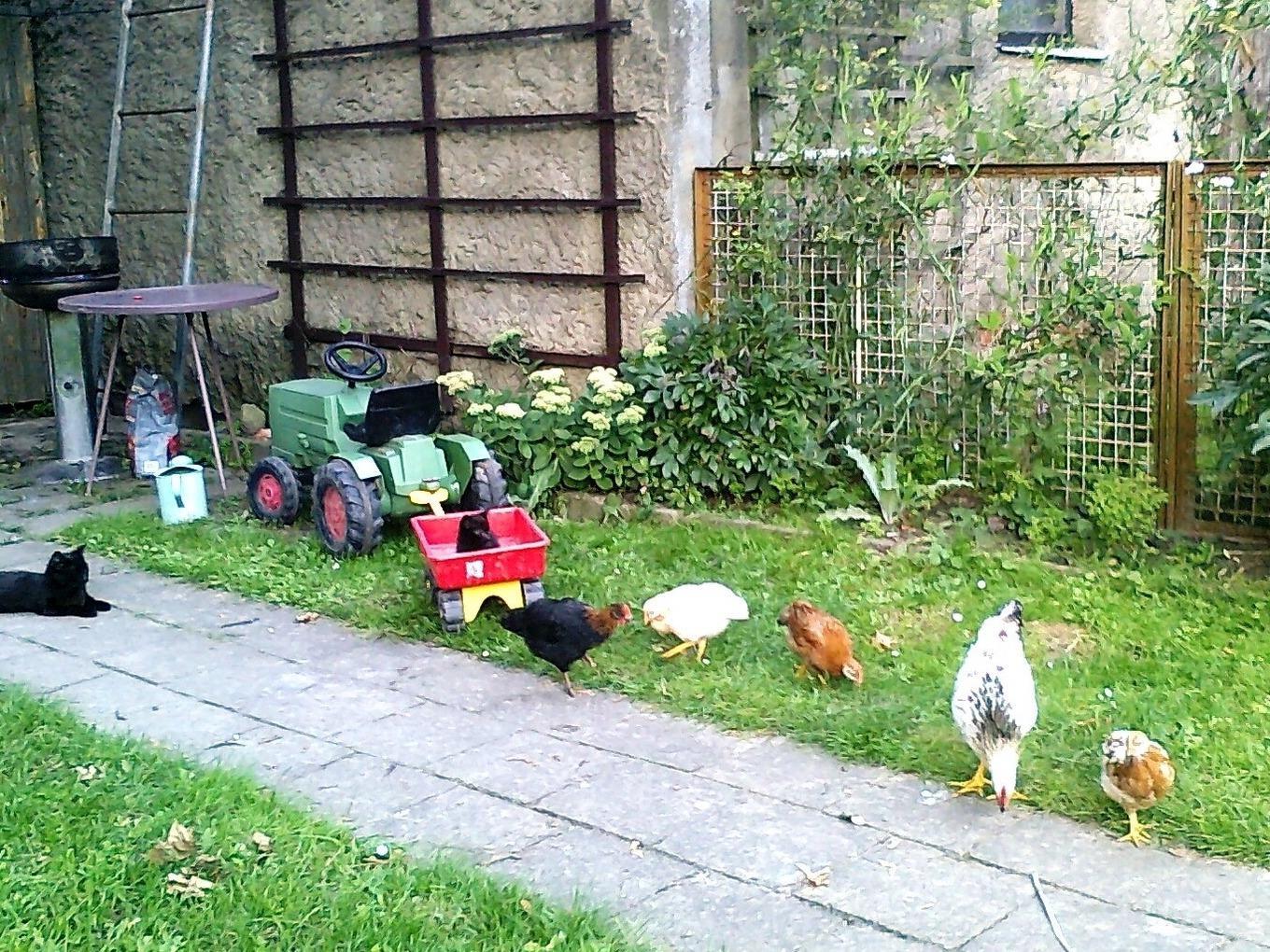 Auf unserem Anwesen befindet sich das große, rekonstruierte ehemalige Dorfschulgebäude, ein Bauerngarten mit großem Naturteich, viel Platz zum Spielen und der Stall für unsere zahlreichen Haustiere. Drei Mecklenburger Kleinpferde, ein Hund sowie fünf Katzen, Kaninchen und Meerschweinchen freuen sich über jede Abwechslung und Streicheleinheit. Unsere Enten und Hühner sorgen neben dem täglich frischen Frühstücksei jedes Jahr mit ihrem Nachwuchs für reichlich Leben auf unserem Hof.