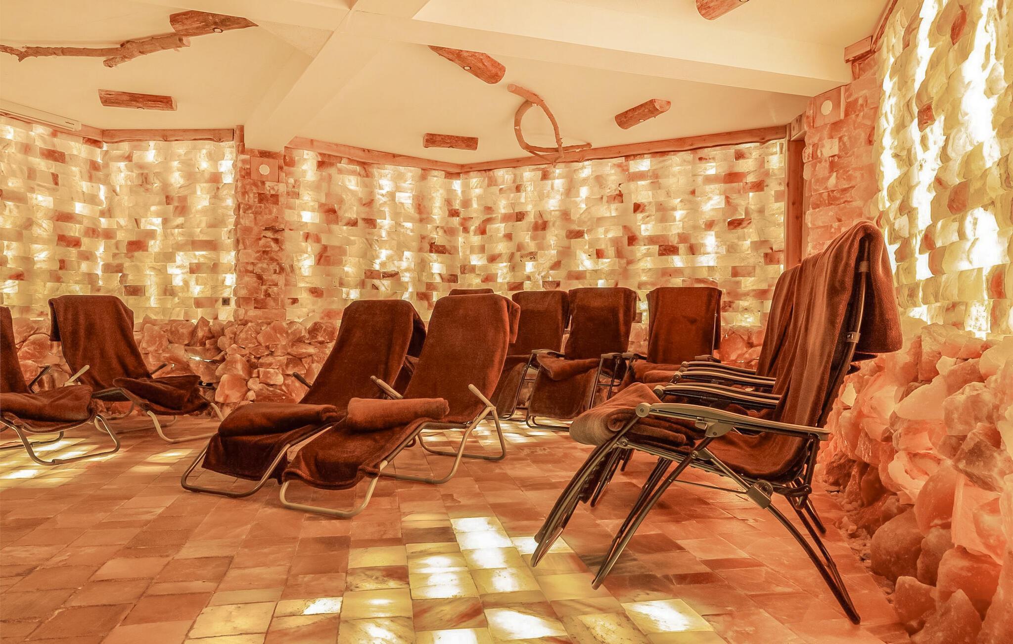 Erleben Sie im Salzreich Trinwillershagen eine Übernachtungsmöglichkeit der besonderen Art. Die Salzmaufaktur bietet seinen Gästen Workshops rund um das Thema Salz, einen Hofladen, einen Gastraum sowie als Highlight einen dreistöckigen Salzturm. Der von außen eher unscheinbar wirkende Turm entpuppt sich in seinem Inneren als absolut erlebenswerte Entspannungs- und Therapie-Oase, insbesondere für Menschen mit Atemwegs- und Hauterkrankungen. Die Wände bestehen aus hinterleuchteten Salzblöcken und in der Mitte ragt ein 7 m hohes Gradierwerk empor, wo eine Spezialsole Ostseewasser über Schwarzdornäste verrieselt und den Raum mit Solepartikeln befeuchtet. Zusätzlich können für die Vernebelungstherapie feinste Aerosolepartikel einer Jod-Brom-Sole elektrostatisch aufgeladen und gleichmäßig in den Raum verteilt werden. Insgesamt wurden hier 32 Tonnen Natursalz verbaut.Das Gästezimmer befindet sich in der dritten Etage des Salzturms und bietet durch die Salzwände über ein einzigartiges, romantisches Ambiente. Der Raum ist ausgestattet mit einem Doppelbett, Sitzmöglichkeiten und mit einem kleinen Kühlschrank. In der 2. Turmetage kann man ein Gäste-WC nutzen. Das eigene Bad mit DU/WC liegt hingegen im Erdgeschoss. Die im Gastraum befindliche Küche kann genutzt werden. Außerhalb der Geschäftszeiten bleiben die Räumlichkeiten des Turms und des Gastraums für Übernachtungsgäste frei zugänglich. Auf Wunsch kann vor Ort Frühstück gebucht werden (15 EUR/Pers.).Zudem stehen Parkplatz, Unterstellmöglichkeit für mitgebrachte Fahrräder und WLAN zur Verfügung.