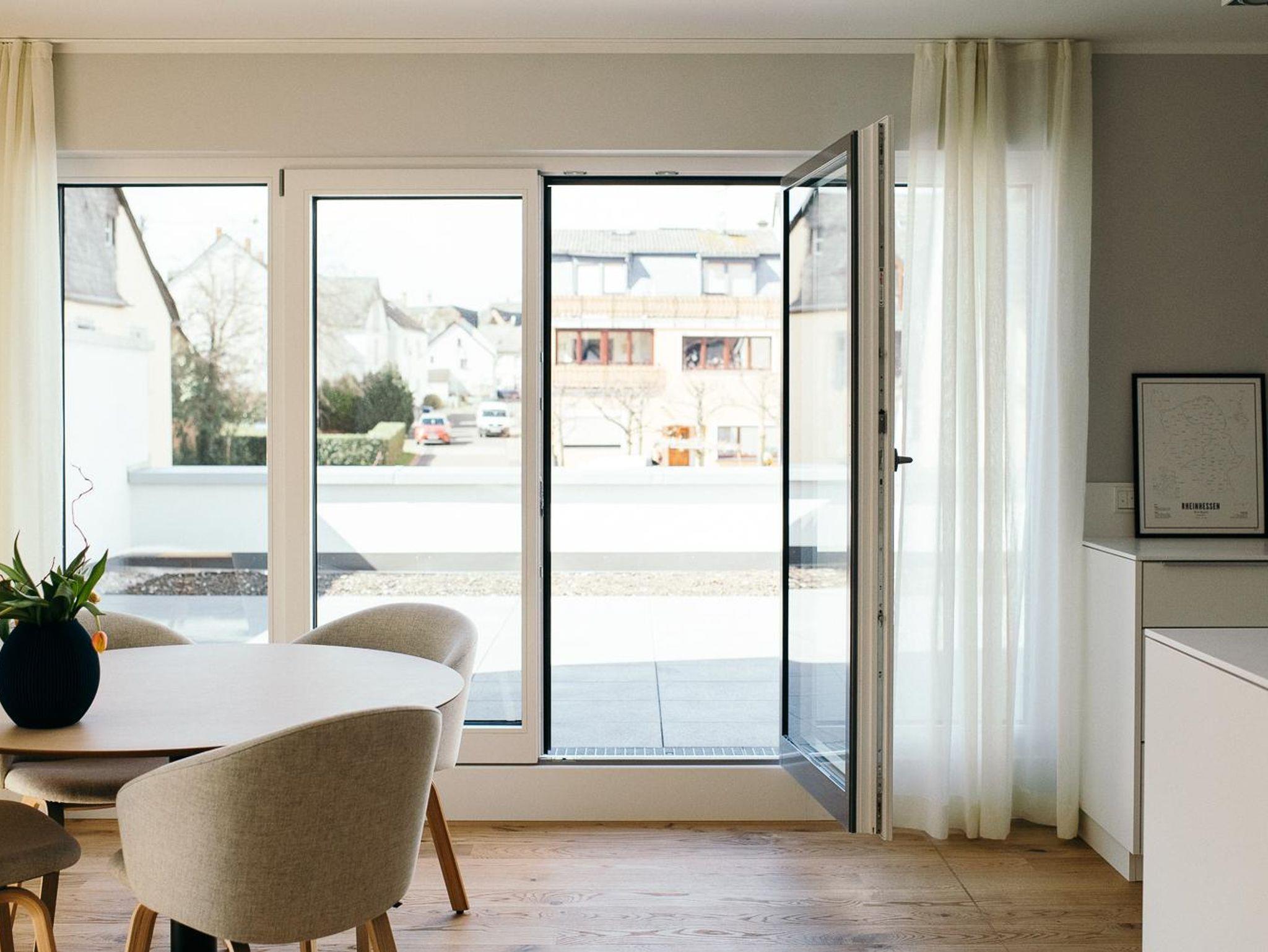 Küche mit großem Wohnbereich und ein toller Blick aus dem Schlafzimmer zur Weinlage Trittenheimer Apotheke.