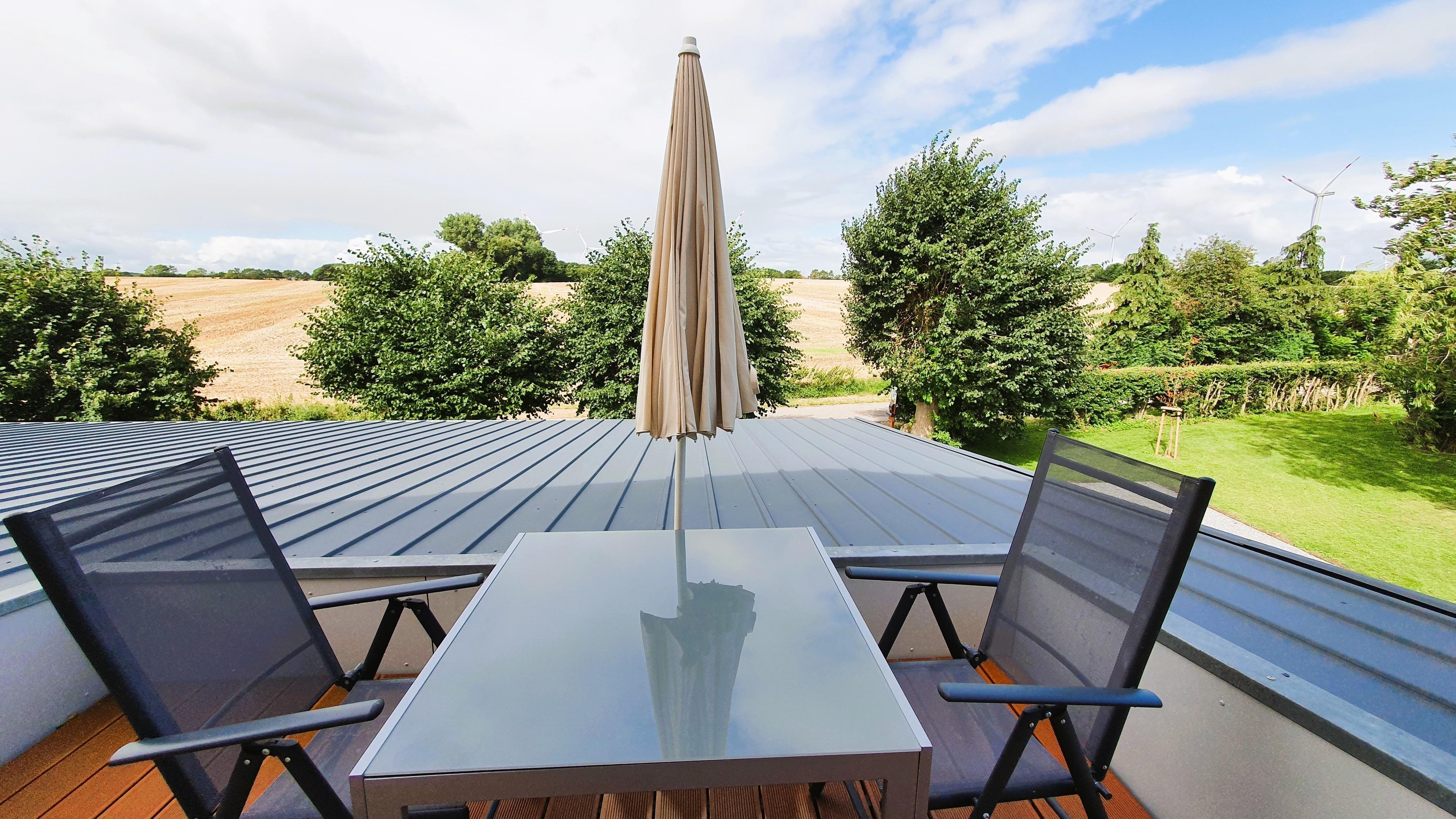 Die geräumige, schöne möblierte Dachterrasse bietet einen malerischen West-Blick über die Felder und in den Garten.
