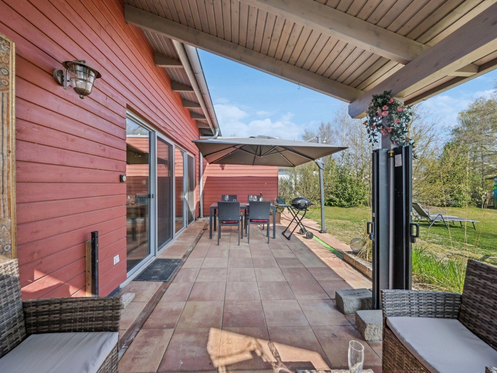 Der Außenbereich des PINTO ROSSO lässt keine Wünsche offen. Ein geräumiger Carport schützt nicht nur Ihr Fahrzeug, sondern ermöglicht einen trockenen Zugang zum Haus. Unter der überdachten Hälfte der Terrrasse findet sich eine Infrarot-Sauna. Im Garten mit grosser Grünfläche steht eine Schaukelbank direkt am See, während am eigenen Steg ein kleines, rotes Ruderboot zu Wasserspaß einlädt. Zusätzlichen Komfort bietet die einzige Elektroauto-Ladestation im Ferienhaus-Park und ein für Gäste nutzbares Gartenhaus.