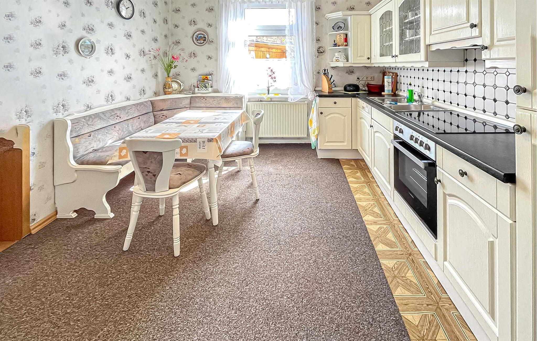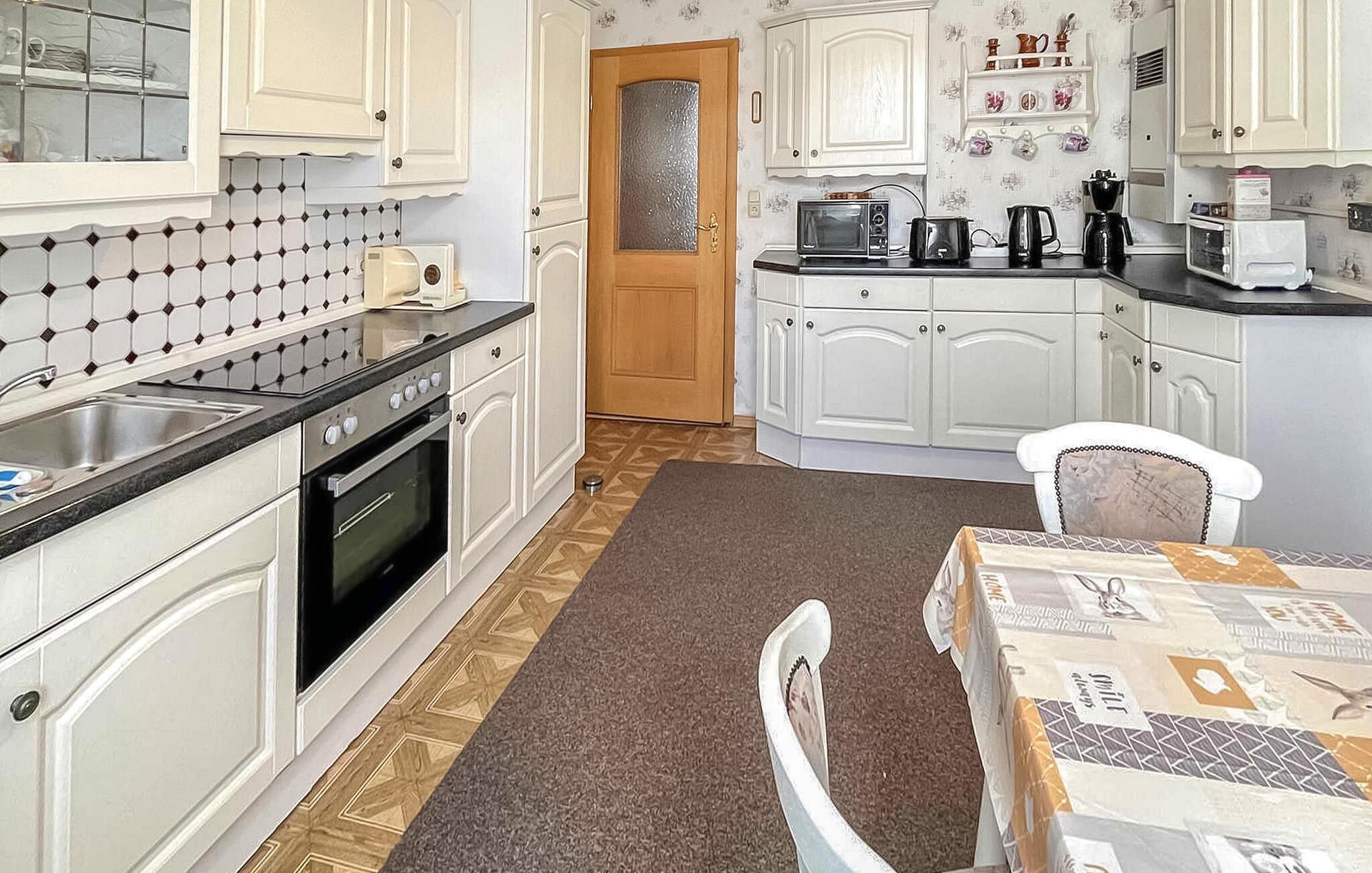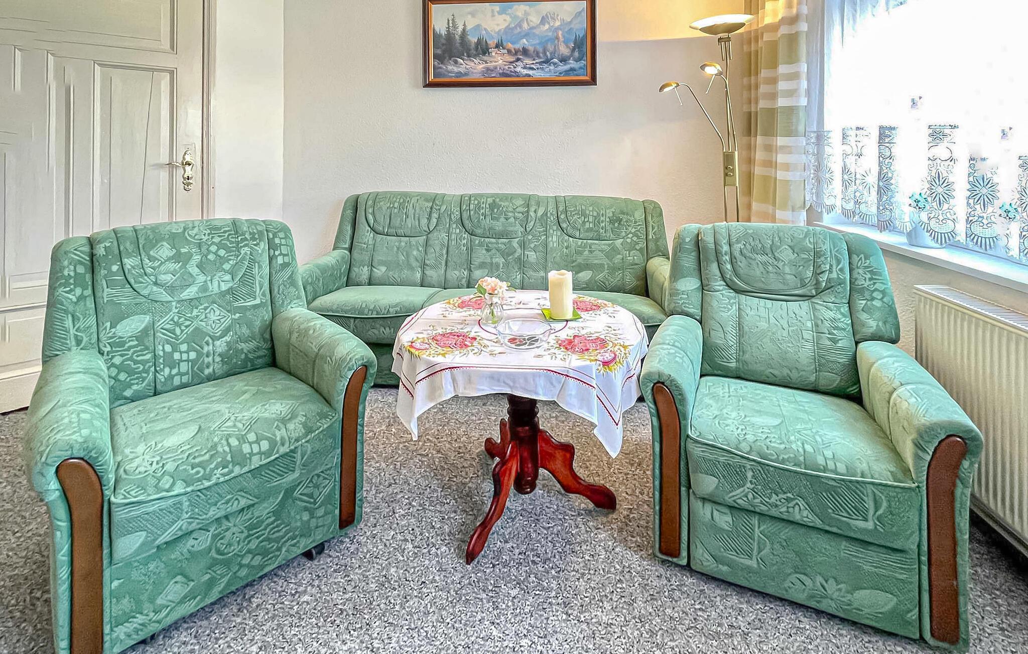Ausstattung mit Wohnraum (Polster-Sitzecke mit Schlaffunktion, SAT-TV, Radio), zwei Schlafräume (Doppelbett bzw. 2 Polsterliegen, Gästebett zum Zustellen), große Küche mit kompletter Küchenzeile (E-Herd mit Backofen, Geschirrspüler, Kühl-Kombination, Essplatz, div. Küchengeräte), Bad mit Wanne und WC, Zentralheizung. Zur Verfügung stehen weiterhin kostenfreies W-LAN, eine überdachte Sitzecke im Freien, Holzkohlegrill, PKW-Stellplatz auf dem Grundstück, Kinderbett und Hochstuhl bei Bedarf sowie ein Fahrradabstellraum.