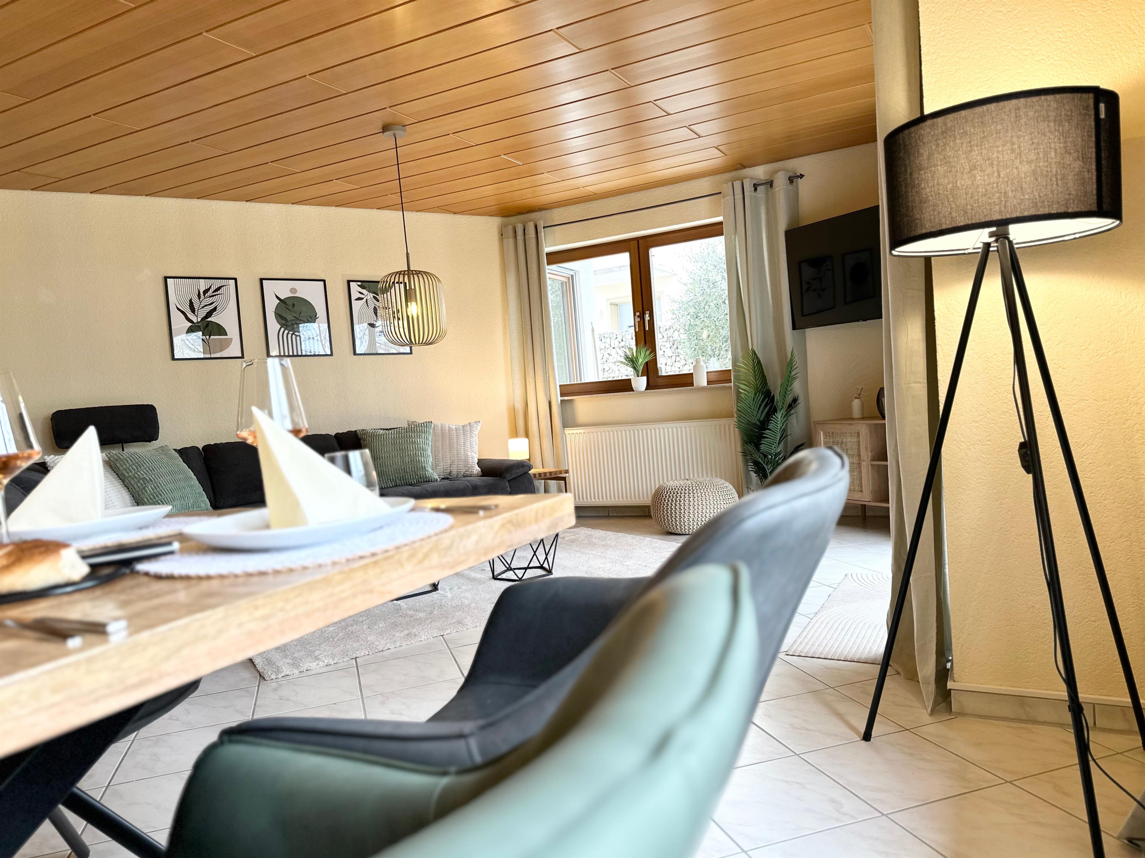 Das stilvolle Wohnzimmer verbindet sich harmonisch mit dem Essbereich und bietet Zugang zur beeindruckenden Terrasse. Das ausziehbare Schlafsofa (1,40 m Breite) schafft zusätzliche Schlafmöglichkeiten und sorgt für ein komfortables Wohnambiente.