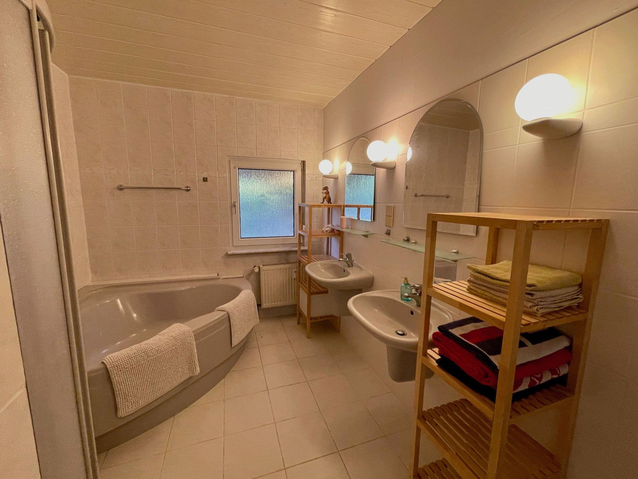 Das Bad im Erdgeschoss hat zwei Waschbecken, eine große Badewanne und eine Dusche.
