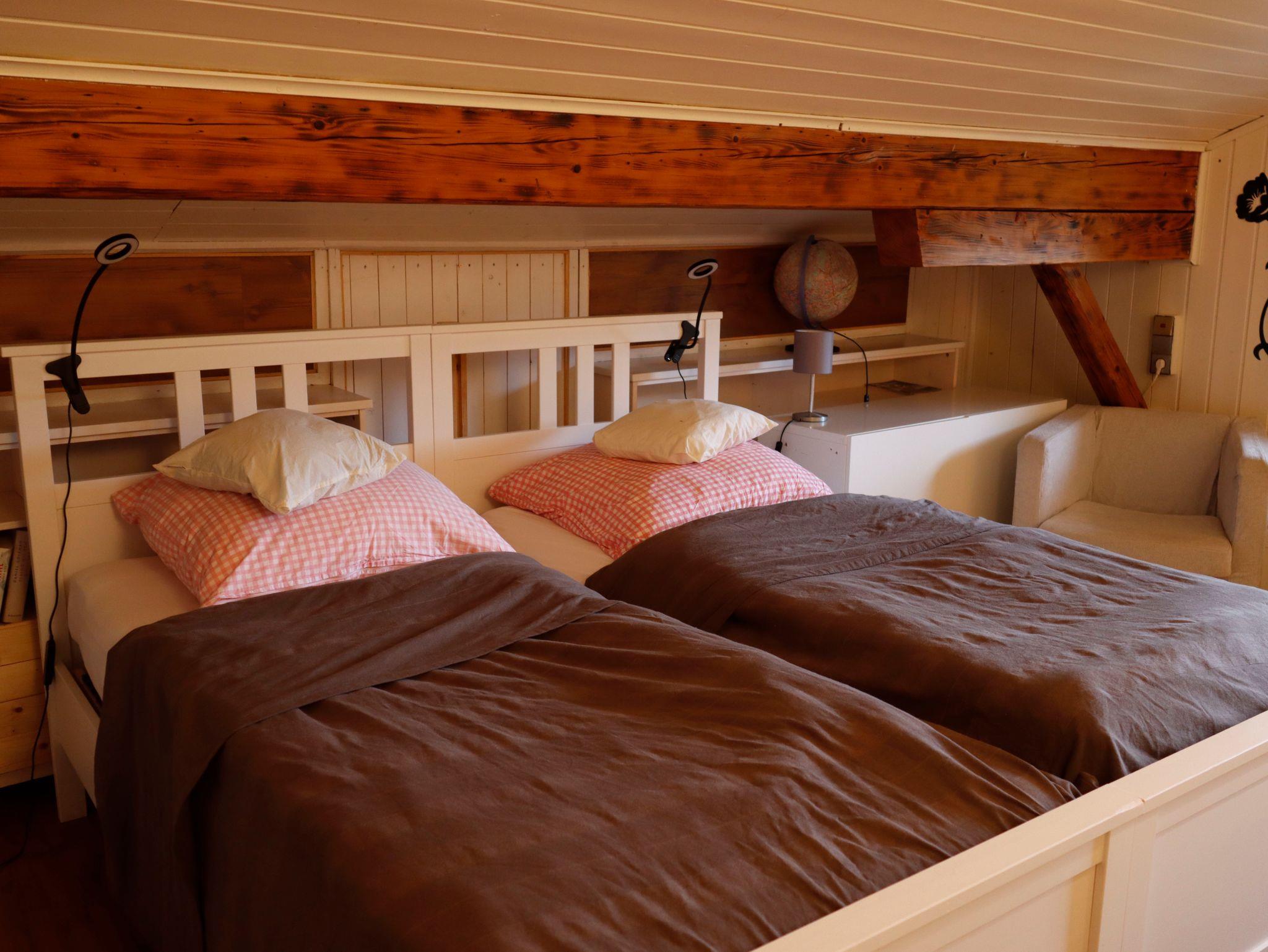 Über die Teppe erreicht man das Dachgeschoß mit 2 Einzelbetten ,Balkon und einem eigenen Bad, mit Dusche, Waschtisch und WC.. .WLAN ist natürlich auch vorhanden