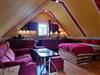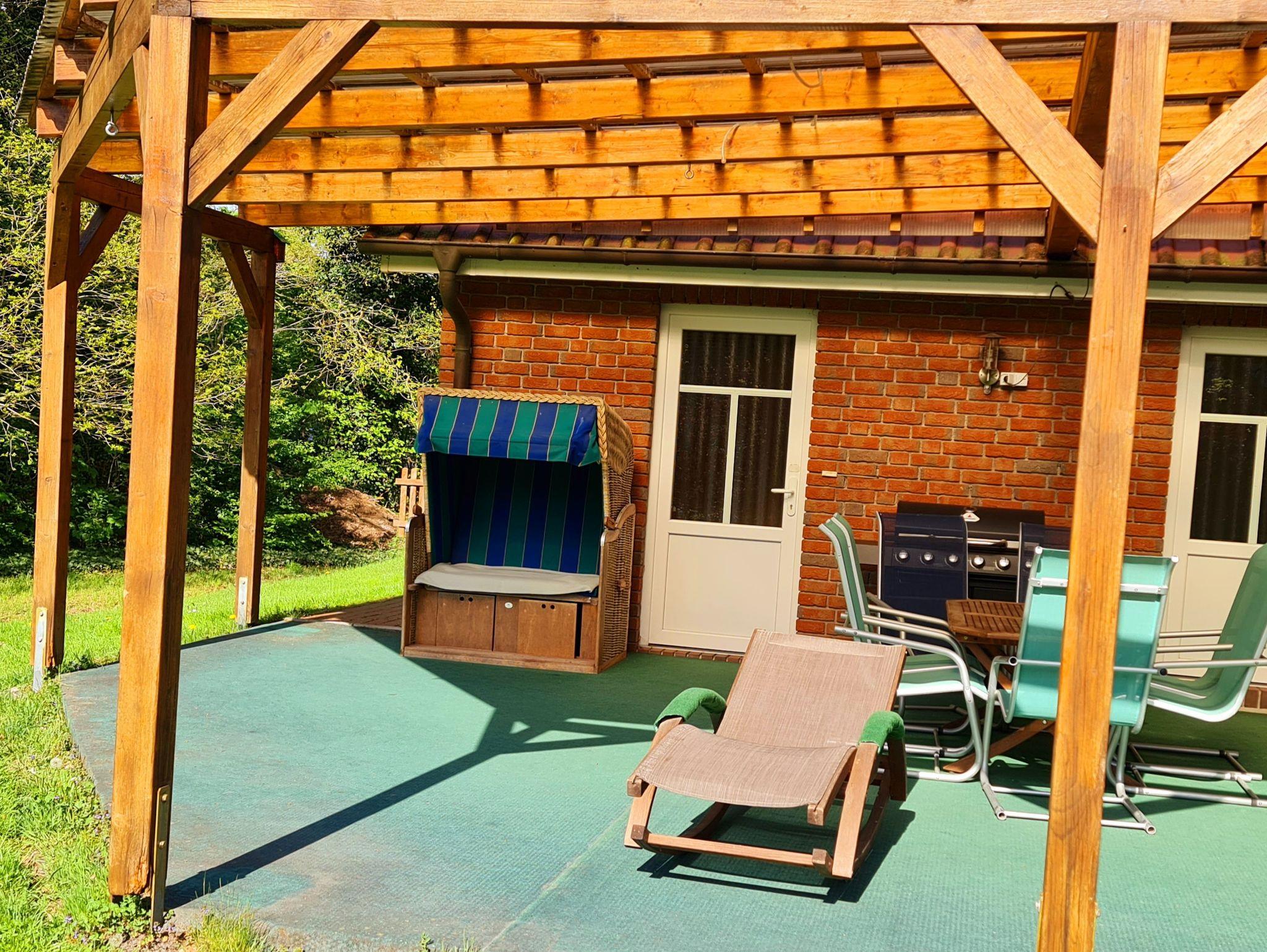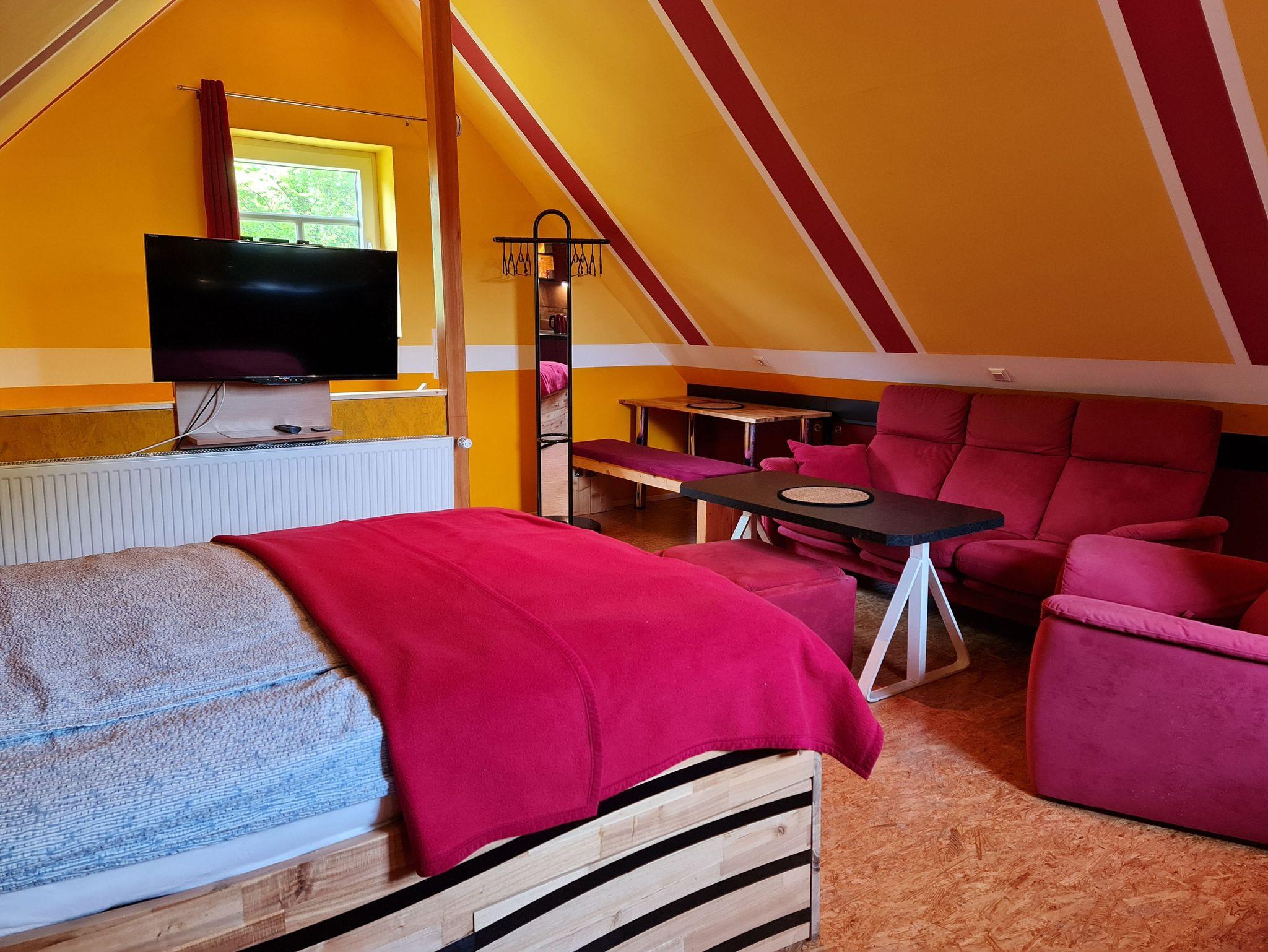 Wenn Sie nun die Treppe hinauf gehen, lädt Sie herzlich ein offener Raum mit einem gemütlichen Bett (180 x 200 cm), eine Sofaecke und eine Küchenzeile zum Kochen ein. Die Küchenzeile ist komplett mit Geschirr, Besteck und Töpfen etc. bestückt und enthält eine Mikrowelle, einen Herd mit Backofen, einen Gefrierschrank und einen Kühlschrank. Zudem müssen Sie nicht von Hand spülen, denn sogar eine Spülmaschine ist vorhanden. Auch auf einen Fernseher brauchen Sie nicht verzichten, dieser ist schwenkbar, sodass man sowohl vom Bett, als auch von der Sitzecke alles im Blick hat. Die Fenster, die sich auf beiden Seiten des Raumes befinden sorgen für ein angenehmes Licht im Raum. Für ein gemütliches Beisammensitzen am Tag oder ein schönes Ausklingen am Abend lädt zusätzlich die große Gartenterrasse mit Strandkorb ein.