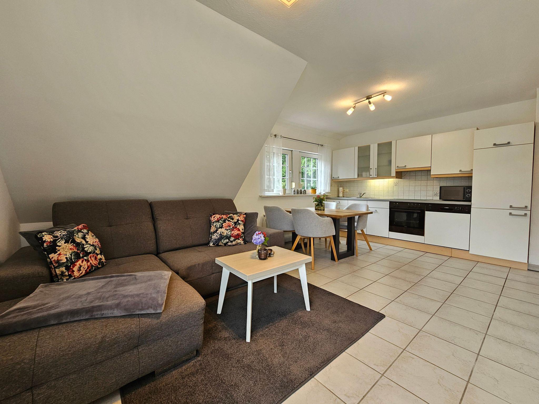 Die Wohnung verfügt über ein separates Schlafzimmer mit einem gemütlichen Doppelbett sowie einen großzügigen Wohn- und Schlafraum, der mit einem bequemen Schlafsofa ausgestattet ist ? perfekt als zusätzliche Schlafmöglichkeit. Der angrenzende offene Küchenbereich ist komplett ausgestattet und bietet alles, was man für einen entspannten Aufenthalt braucht: Backofen, Kühlschrank mit Gefrierfach, Mikrowelle, Spülmaschine, Kaffeemaschine, Wasserkocher und weiteres Kochzubehör.