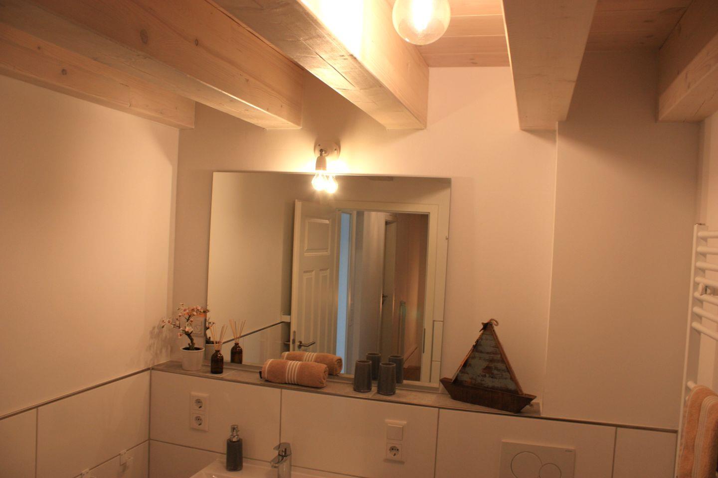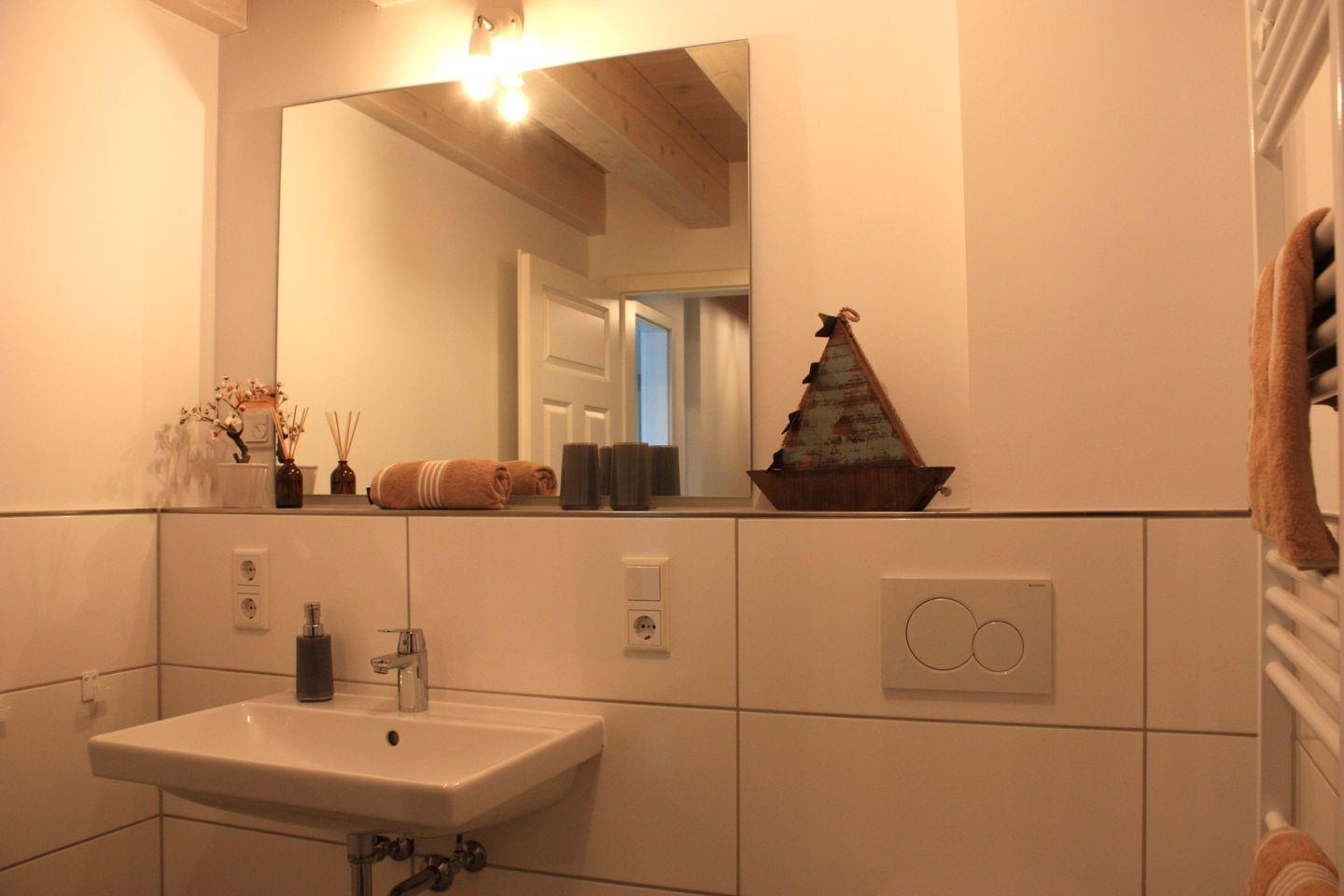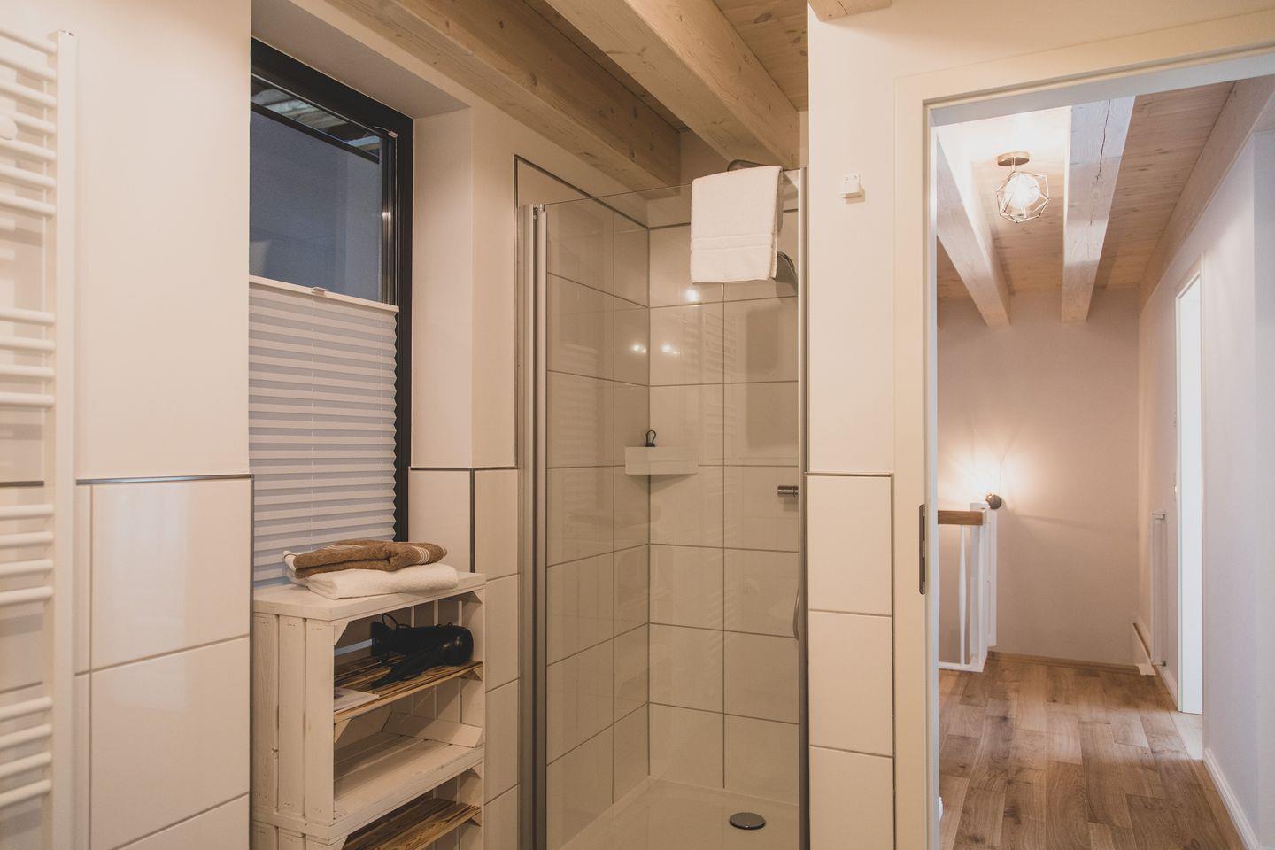 Im Obergeschoss befinden sich zwei Schlafzimmer sowie ein geräumiges Bad mit Dusche. Im Schlafzimmer 1 befindet sich ein Doppelbett, Schlafzimmer 2 bietet Platz für bis zu drei (ggf. auch vier) Kinder. Alternativ kann die Wohnung auch von 4 erwachsenen Feriengästen genutzt werden, da in Schlafzimmer 2 auch ein Doppelbett darstellbar ist. Beide Schlafzimmer verfügen über Verdunkelungs- und Insektenschutzrollos.