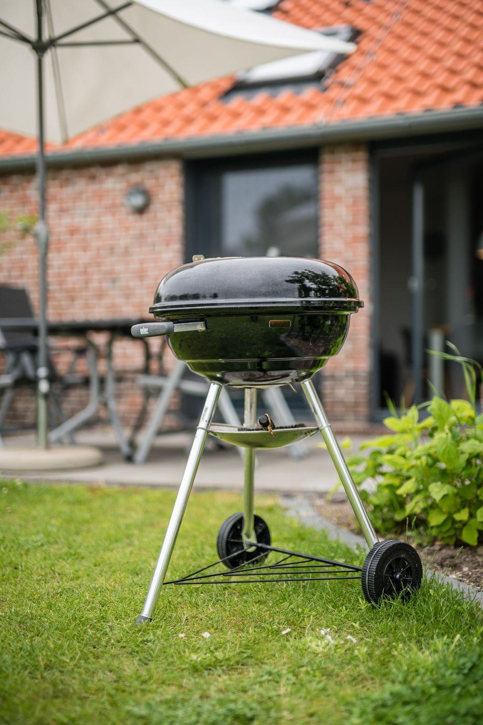 Die nach Süden ausgerichtete Terrasse ist bequem vom Wohnbereich zugänglich und eröffnet einen herrlichen Blick auf die angrenzende Obstwiese und die ostfriesische Landschaft. Gartenmöbel, Sonnenschirm und Grill stehen zur Benutzung bereit.
