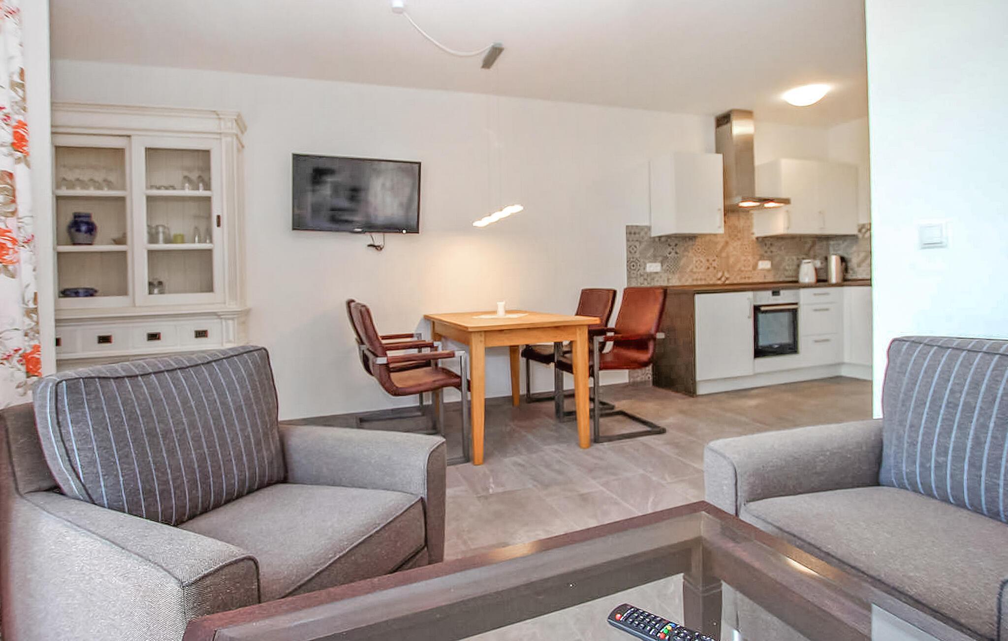 Diese zentral beheizte Nichtraucherwohnung mit separatem Eingang befindet sich im Erdgeschoss (40 sqm) des Hauses und ist über einen gemeinsamen Flur zu erreichen. Die Wohnung ist mit einem Wohnzimmer ausgestattet, Sitzecke mit Polstergarnitur (Esstisch, Flachbild-TV), offener Küche (E-Herd mit Backofen, Kühlschrank, Spülmaschine, div. Küchenkleingeräte), Schlafraum (Doppelbett), Bad (Dusche, WC) und Terrasse ausgestattet. Weiterhin stehen Parkplätze, Grill, auf Anfrage Kinderbett und Hochstuhl sowie W-LAN zur Verfügung.