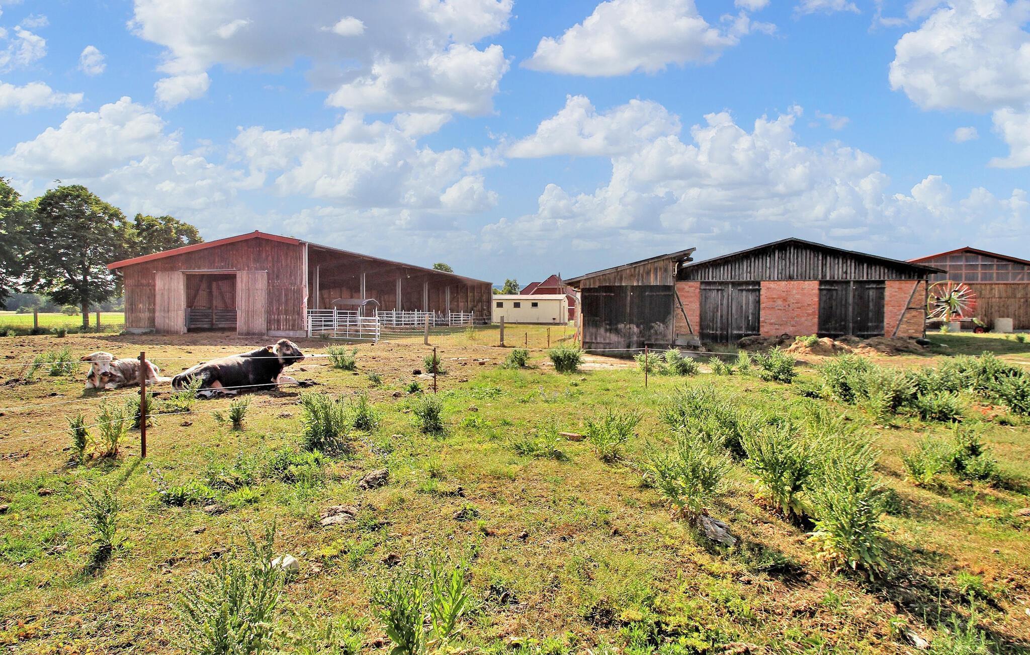 In idyllischer Ruhe und familiärer Atmosphäre, abseits des Stadtlärmes, auf einem British Longhorn Hof, befinden sich auf dem ca. 300 qm großen, umzäunten Grundstück in der Doppelhaushälfte eines 2017 erbauten Wohnhauses zwei Ferienwohnungen für 2 bzw. 4 Personen. Sie werden nachhaltig durch großflächige Solaranlagen auf Stall und Scheune versorgt.Hier finden die Gäste noch echtes Landleben zum Anfassen neben einer urigen Mutterkuhherde werden Hühner, Schafe und Ziegen alter Rassen in extensiver Weidewirtschaft gehalten. In der offenen Wald- und Wiesenlandschaft vor der Terrasse bzw. dem Balkon fühlen sich u.a. Gänse und Kraniche zu Hause. Die ruhige Lage der Wohnungen, etwas abseits des Dorfes ist idealer Ausgangspunkt für ausgedehnte Fahrradtouren. Die Gegend bietet darüber hinaus unzählige Wanderwege, Badestellen und andere Ausflugsmöglichkeiten für Erwachsene und Kinder.