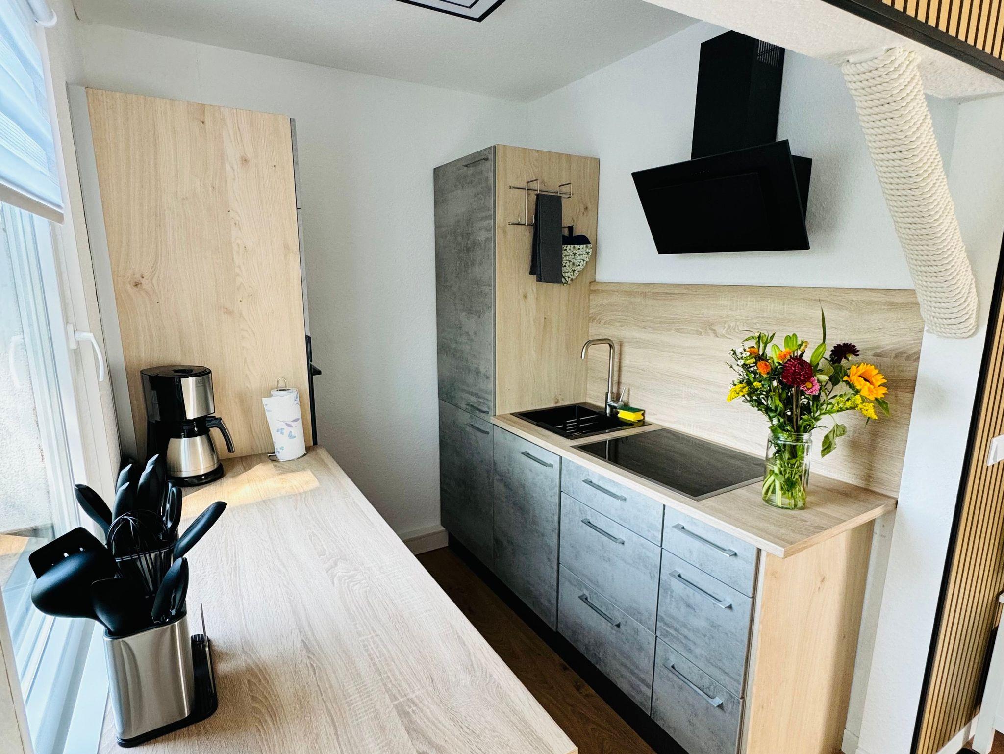 - eine Voll ausgestattete offene Küche mit Geschirrspüler, Mikrowelle, Backofen, Herd, und Kaffeemaschine