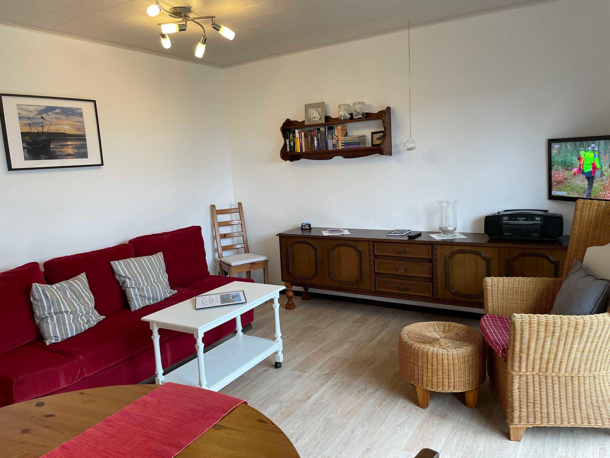 Unsere Wohnung im Erdgeschoss rechts ist ca. 50m² groß und verfügt über eine moderne technische Ausstattung: neben einem Radio mit CD-Laufwerk steht Ihnen ein moderner Flachbildfernseher mit Satellitenempfang zur Verfügung. Die voll ausgestattete Küche bietet neben einer Mikrowelle, einem Kühlschrank und einer Kaffeemaschine auch einen Geschirrspüler, so dass Sie in Ihrem Urlaub auf keinen Komfort verzichten müssen. Die Wohnung ist barrierefrei, wenn auch nicht behindertengerecht ausgestattet -bei Fragen sprechen Sie uns gerne an! Für weitere Gäste lässt sich das Sofa im Wohnzimmer zu einem vollwertigen Doppelbett ausklappen, so dass insgesamt bis zu vier Personen in unserer Parterrewohnung Platz finden.