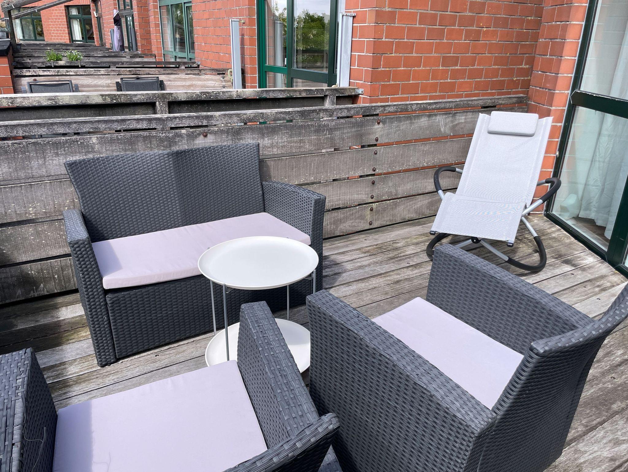 Ferienwohnung Blue Sky in Dangast bietet moderne Architektur und zwei Balkone mit Blick ins Grüne.