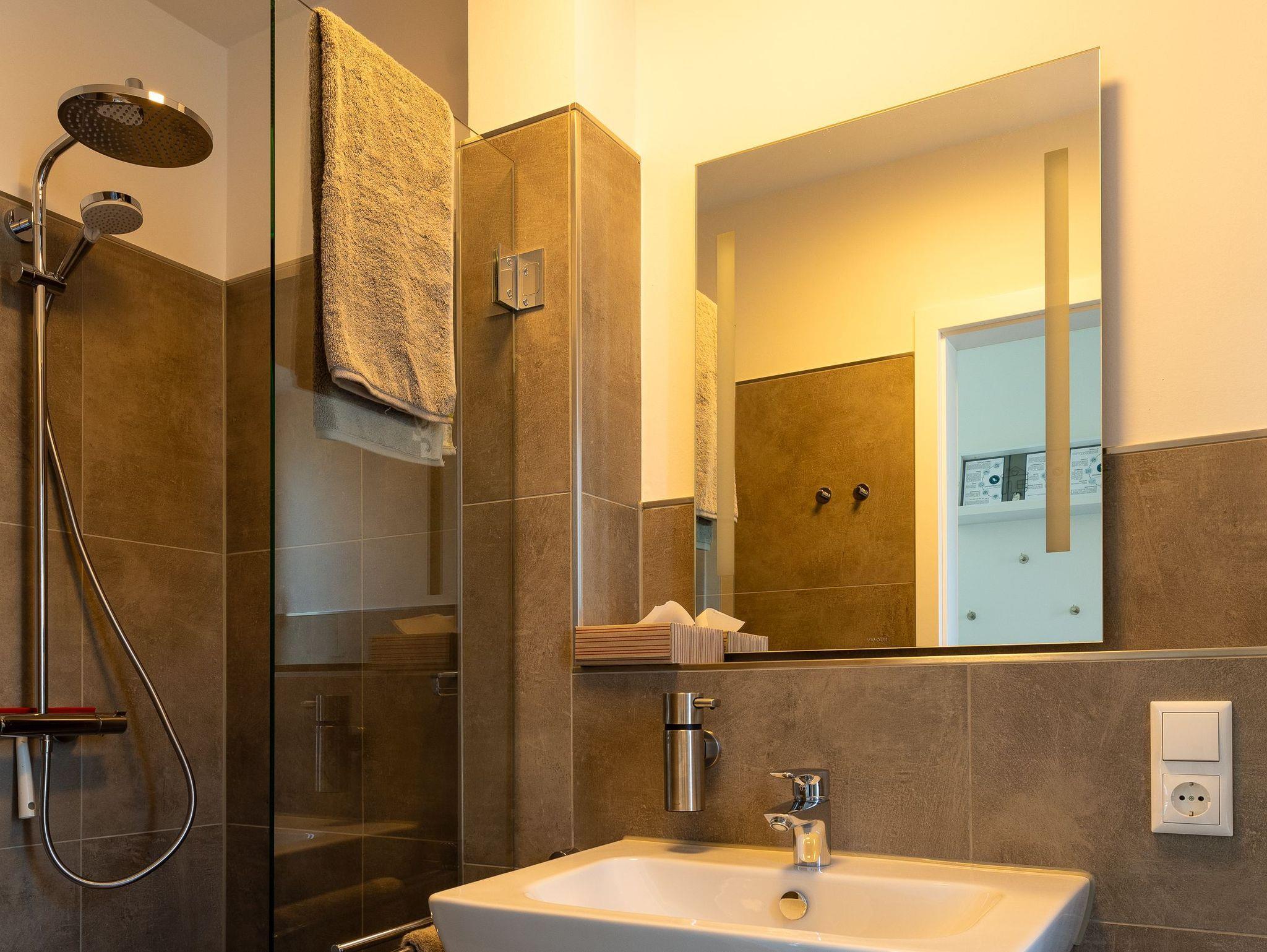 Duschbad (EG): Bodentiefe barrierefreie Dusche, Waschtischanlage mit Spiegel und Unterschrank, WC, Kindertritt, Handtuchhaken, Handtuchheizkörper, Fenster zum Lüften.
