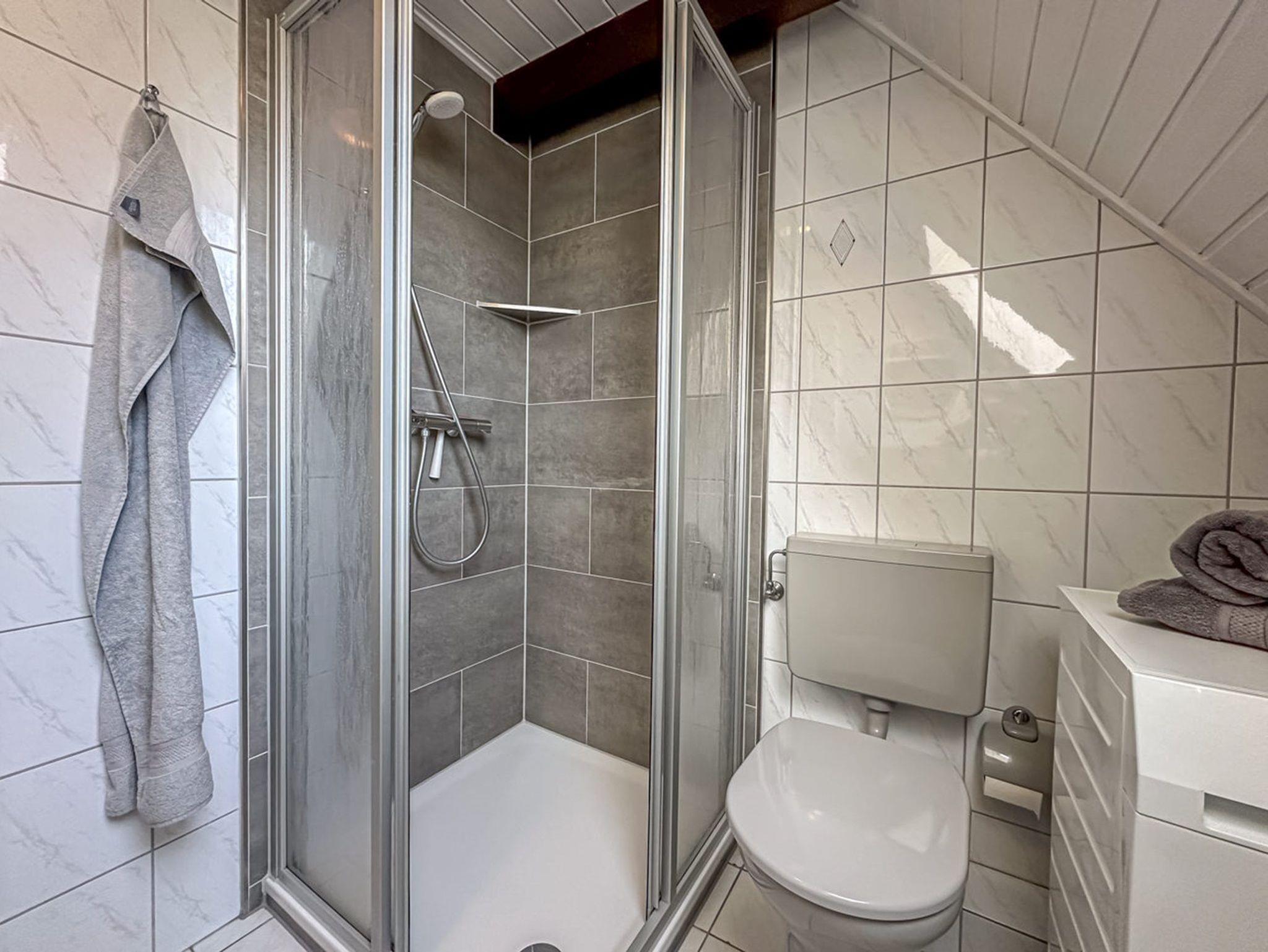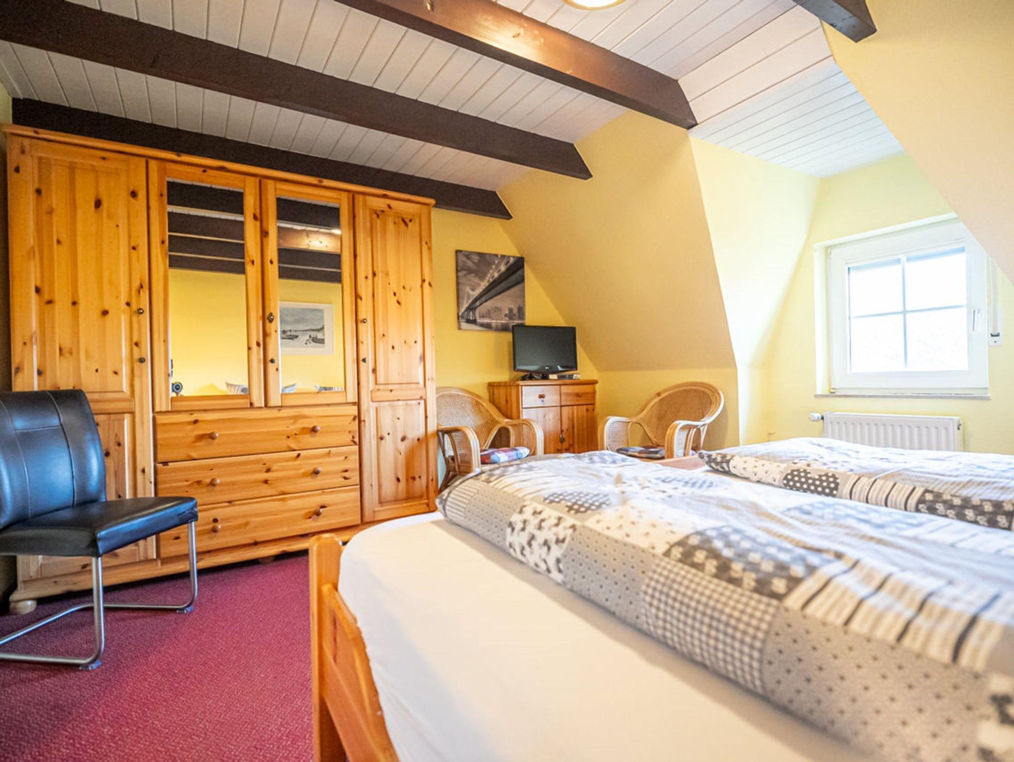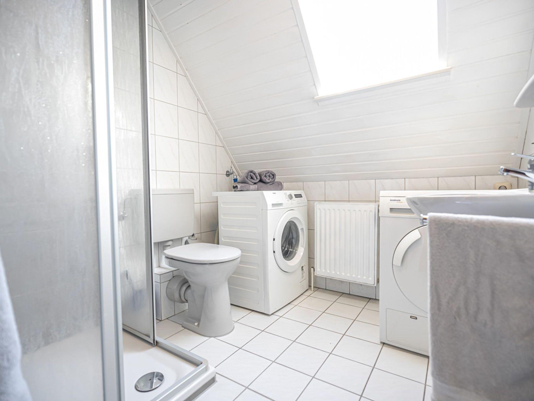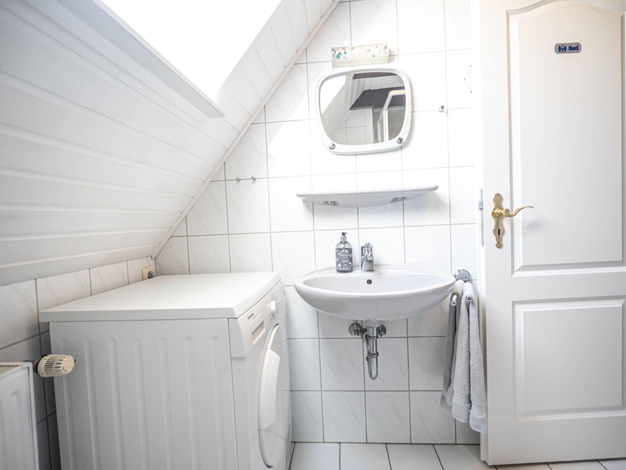 Im ersten Obergeschoss liegen zwei helle Schlafräume mit je zwei Einzelbetten und einem Doppelbett - hier befindet sich das zweite TV-Gerät. - sowie das freundliche Fenster-Duschbad mit Waschmaschine und Trockner. Im Dachgeschoss gibt es noch ein weiteres Schlafzimmer mit zwei Einzelbetten und dem dritten Fernseher.