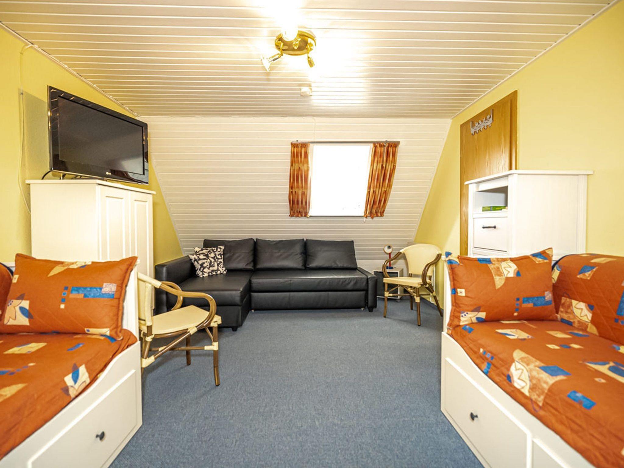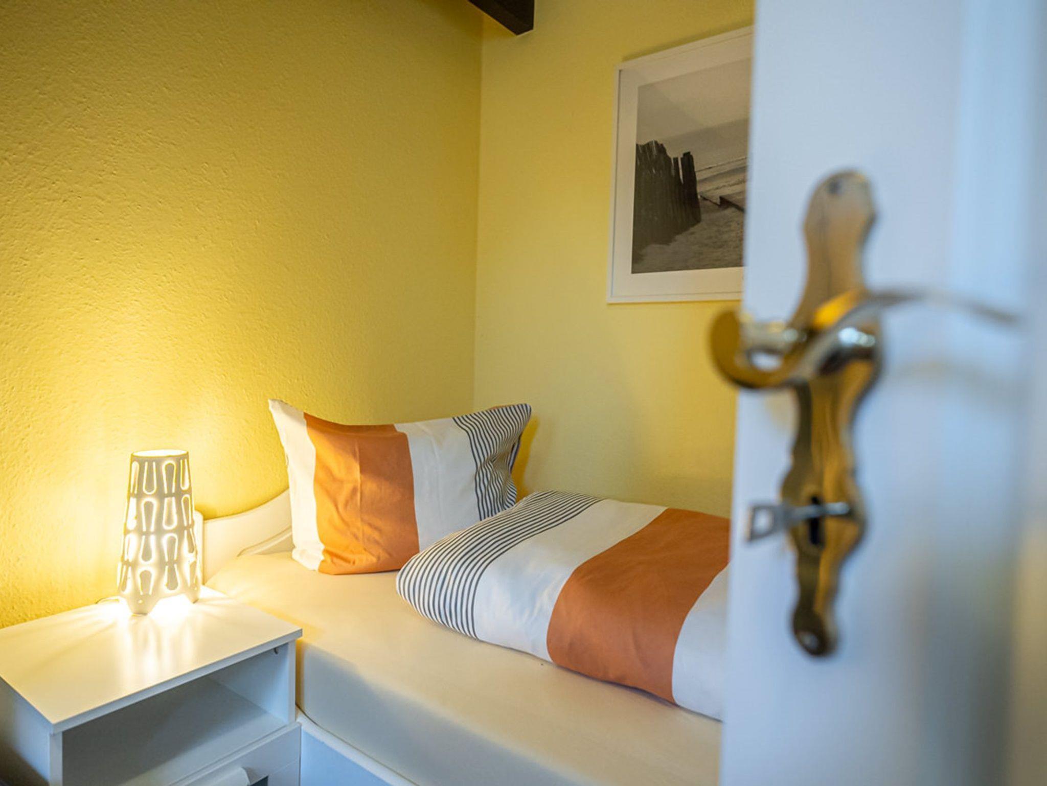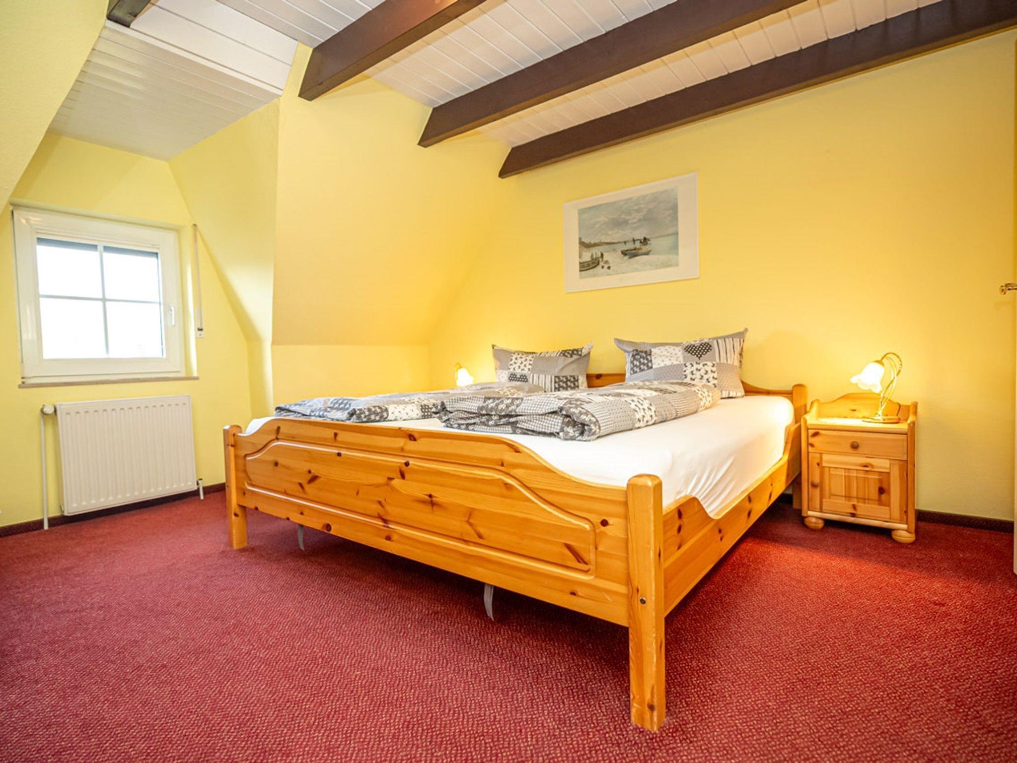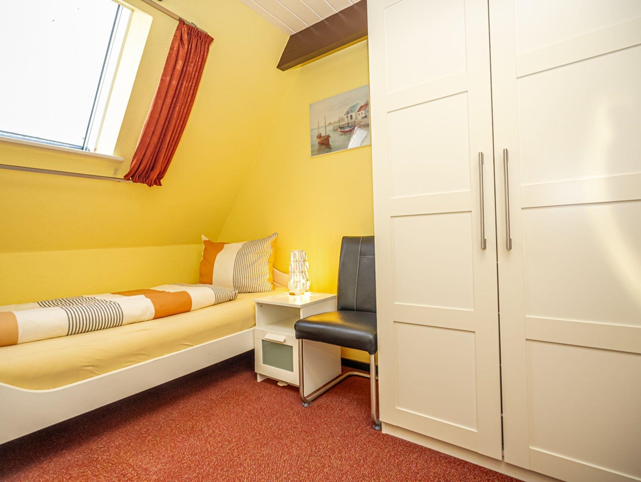Im ersten Obergeschoss liegen zwei helle Schlafräume mit je zwei Einzelbetten und einem Doppelbett - hier befindet sich das zweite TV-Gerät. - sowie das freundliche Fenster-Duschbad mit Waschmaschine und Trockner. Im Dachgeschoss gibt es noch ein weiteres Schlafzimmer mit zwei Einzelbetten und dem dritten Fernseher.