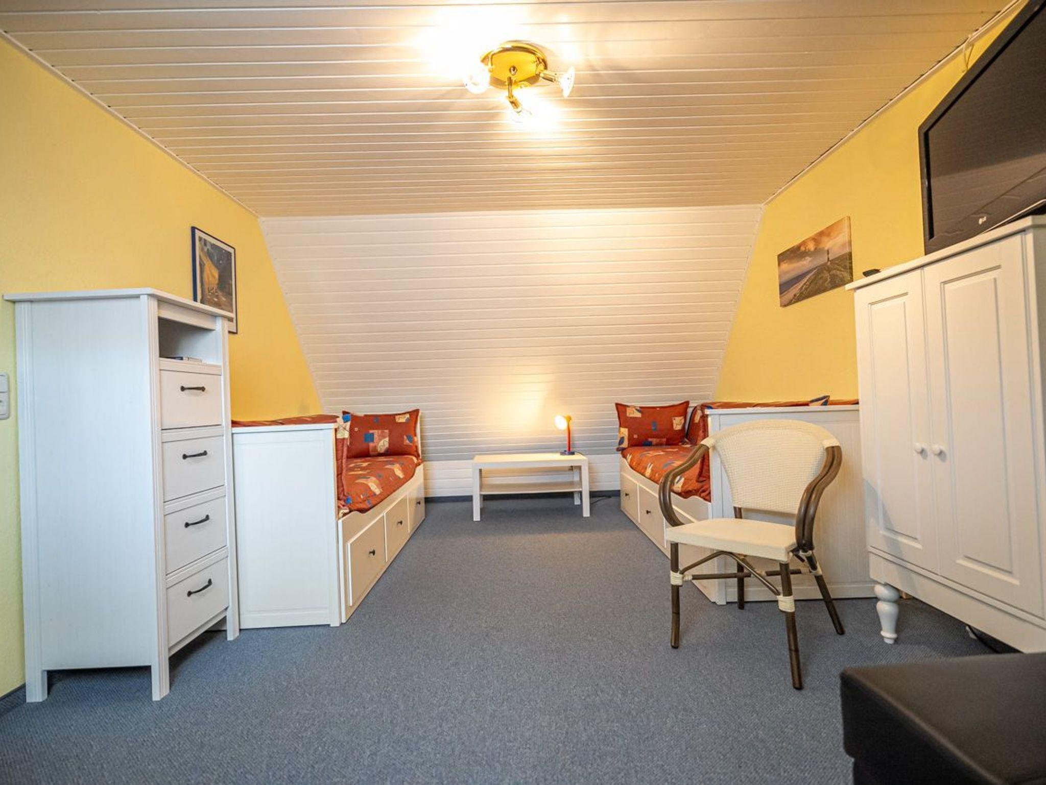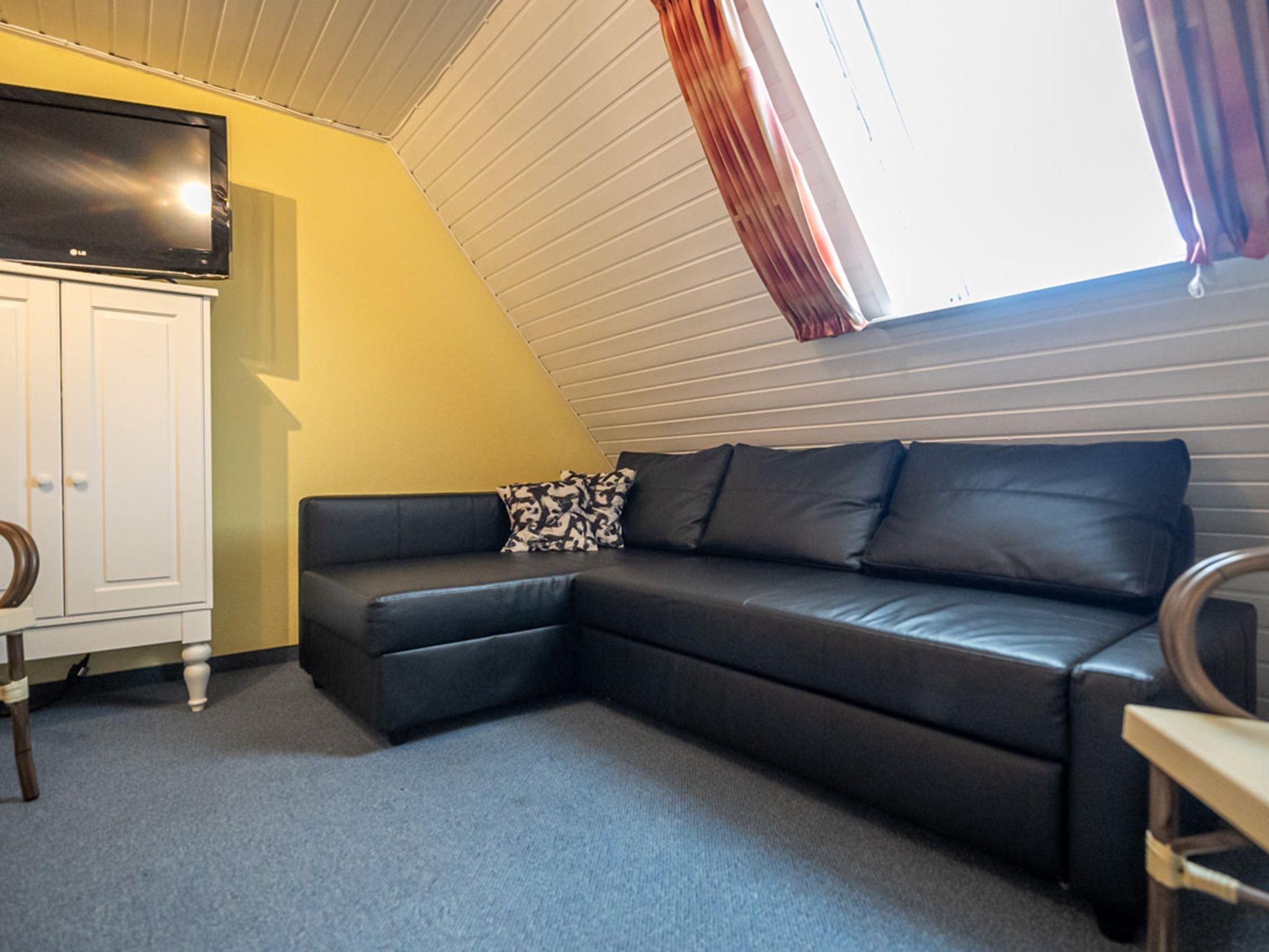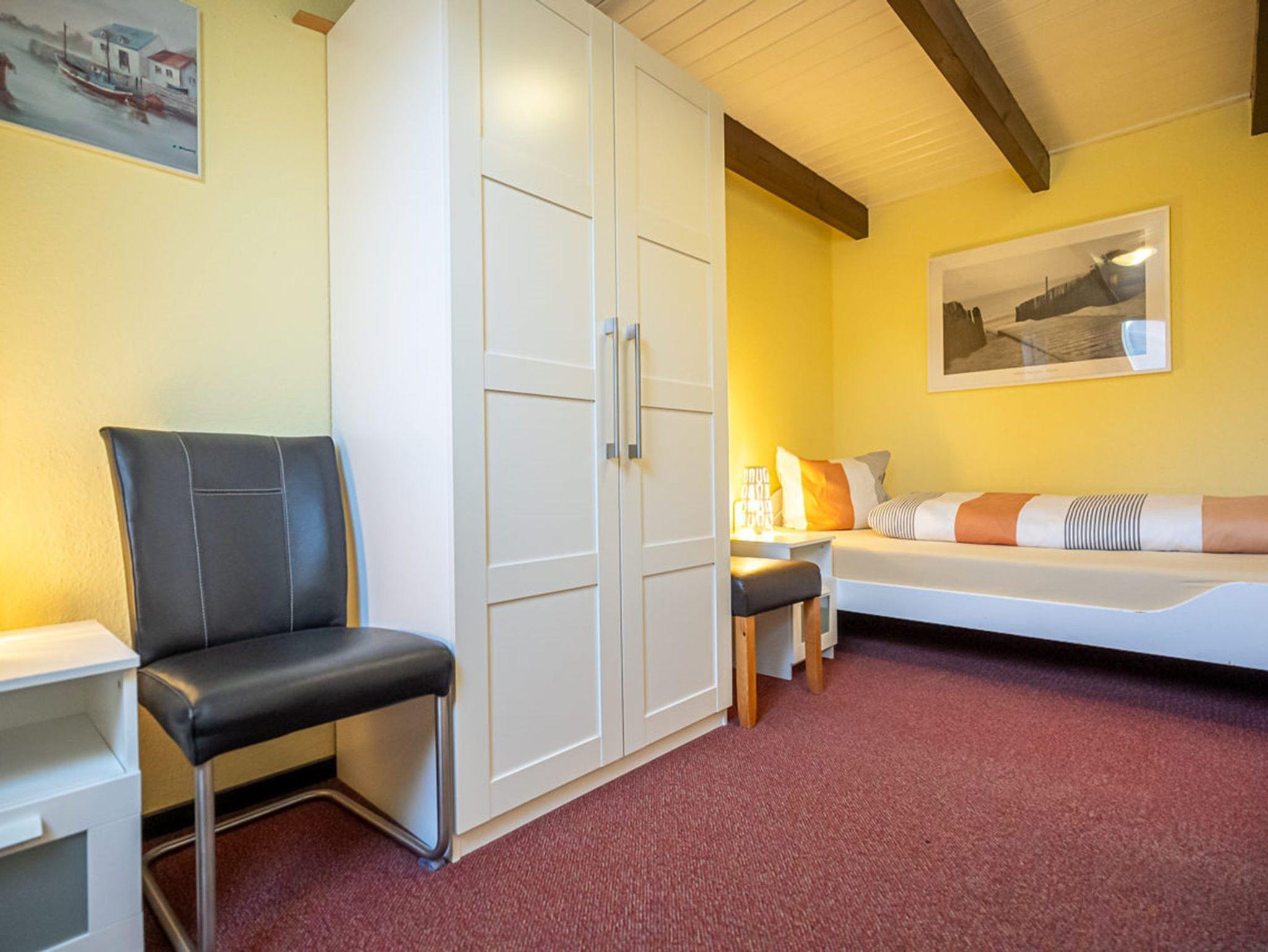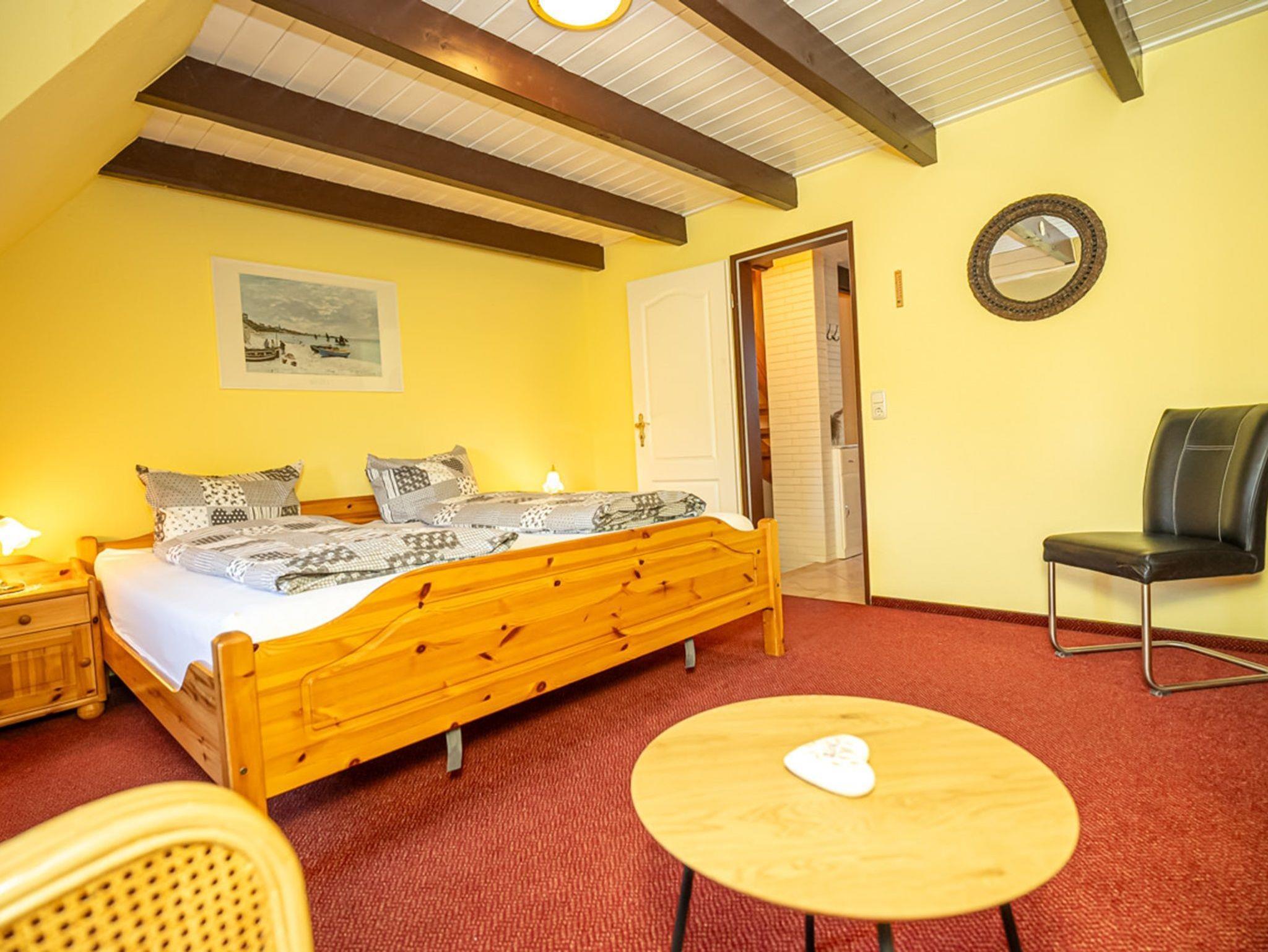 Im ersten Obergeschoss liegen zwei helle Schlafräume mit je zwei Einzelbetten und einem Doppelbett - hier befindet sich das zweite TV-Gerät. - sowie das freundliche Fenster-Duschbad mit Waschmaschine und Trockner. Im Dachgeschoss gibt es noch ein weiteres Schlafzimmer mit zwei Einzelbetten und dem dritten Fernseher.