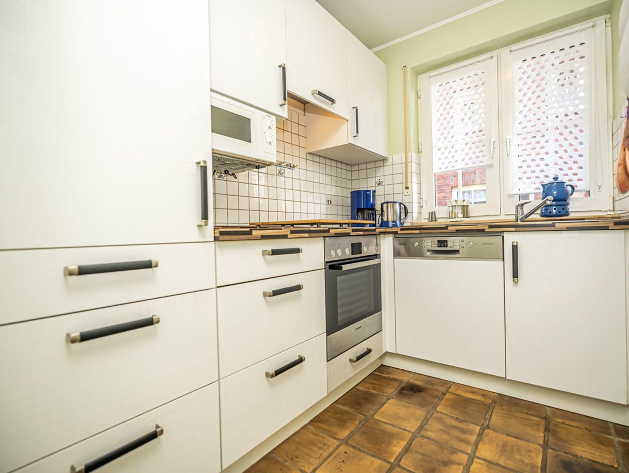 Zentral und doch ruhig an der Edo-Wiemken-Straße 56E gelegen betreten Sie den Flur des komfortablen Ferienhauses mit Garderobe und Gäste-WC. Sie gelangen in den geräumigen, kombinierten Wohn-/Essbereich mit mediterraner Möblierung und schickem Essplatz. Ihr Blick fällt auf das umfriedete Grundstück mit begrünter Terrasse, Gartenmobiliar und Sonnenschutz.