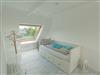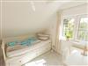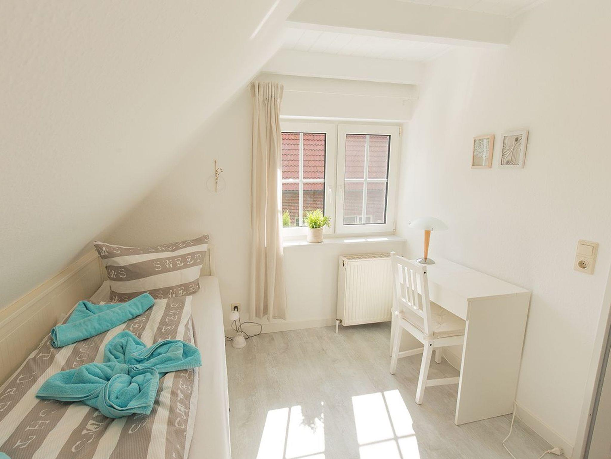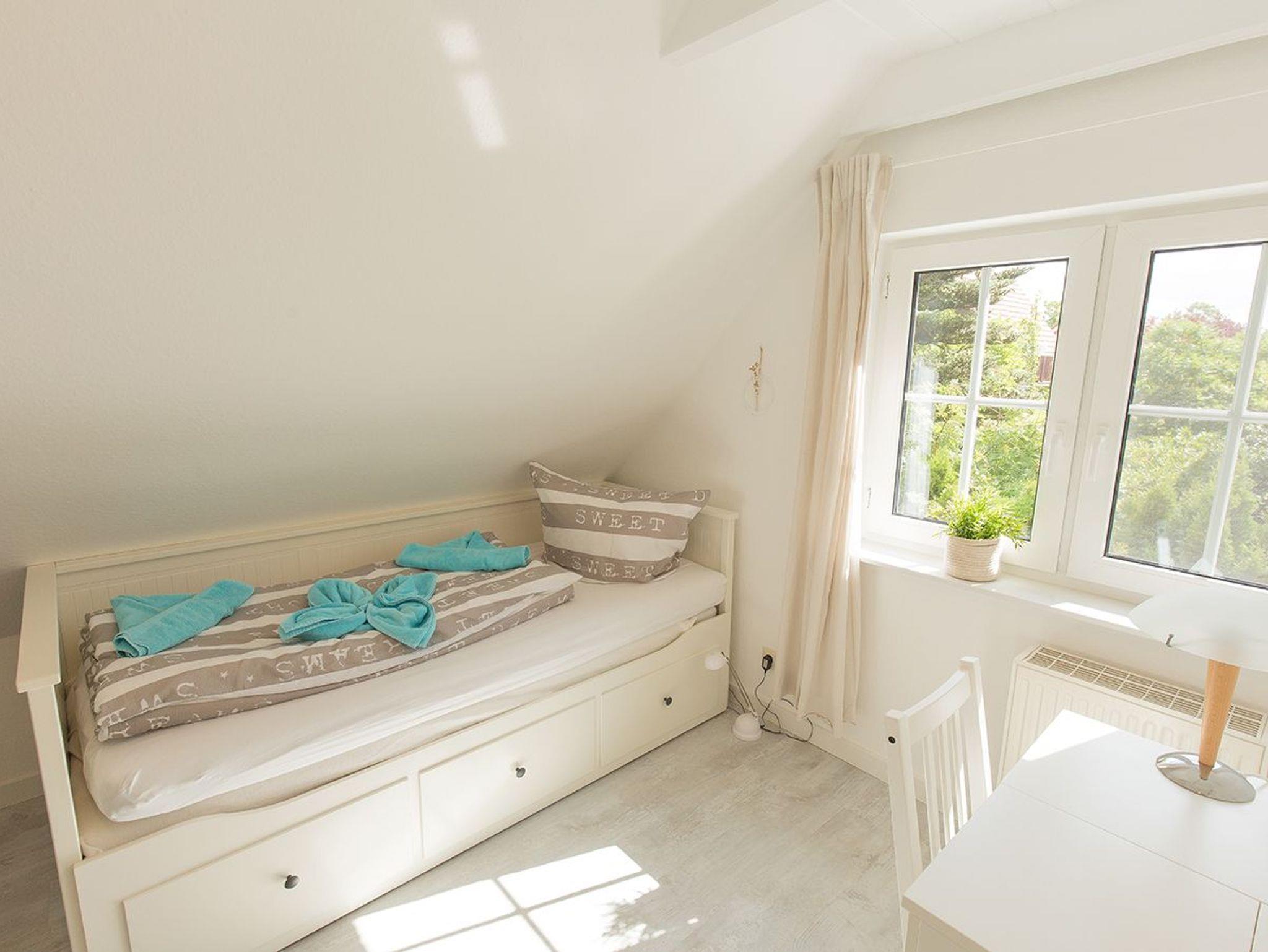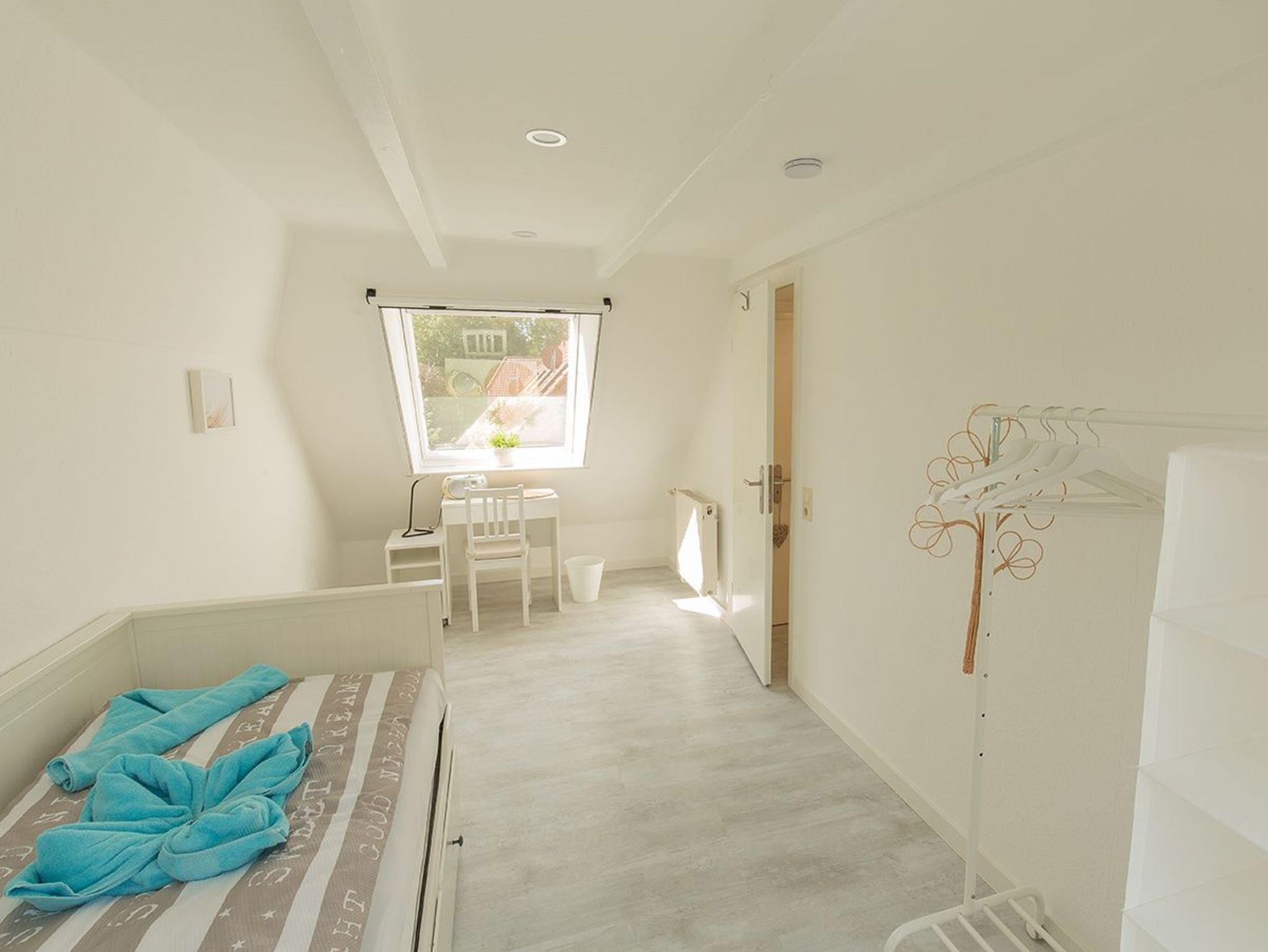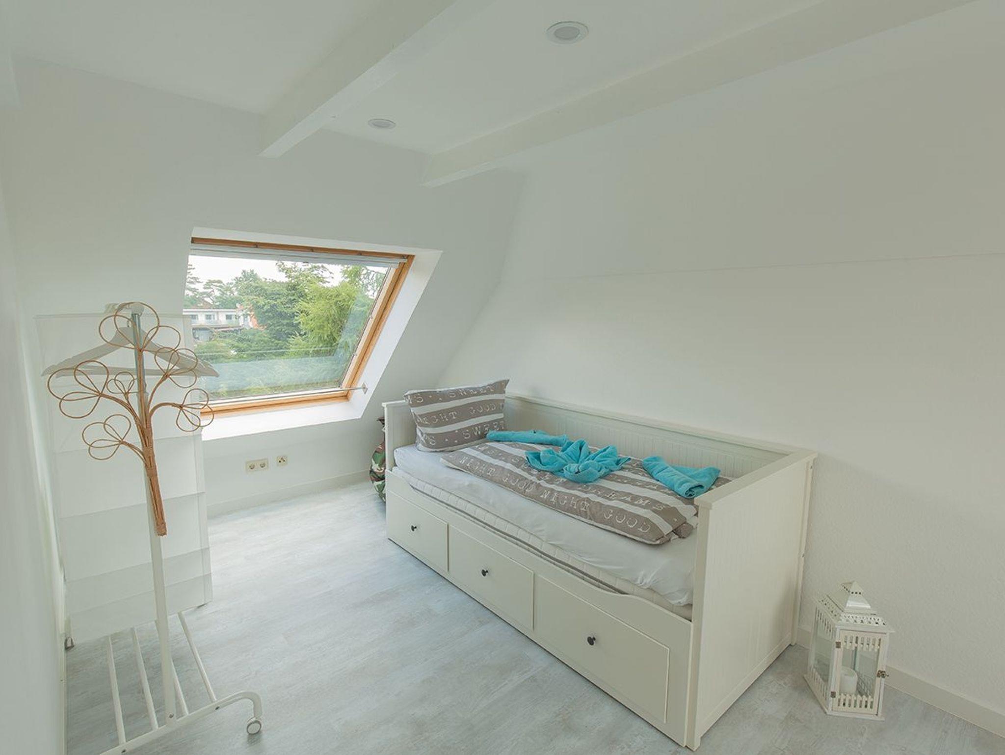 Ein weiteres geräumiges Schlafzimmer liegt im Dachgeschoss mit großen Fenstern und Aussicht über Dangast. Alle Fenster des Hauses verfügen über einen Mückenschutz.