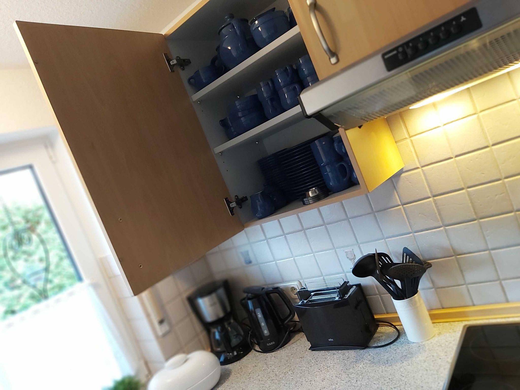Im Erdgeschoss des Hauses finden Sie die offene, voll ausgestattete Küche mit Spülmaschine, Wasserkocher, Toaster, Kaffeemaschine, Kühlschrank mit Gefrierfach und Mikrowelle.