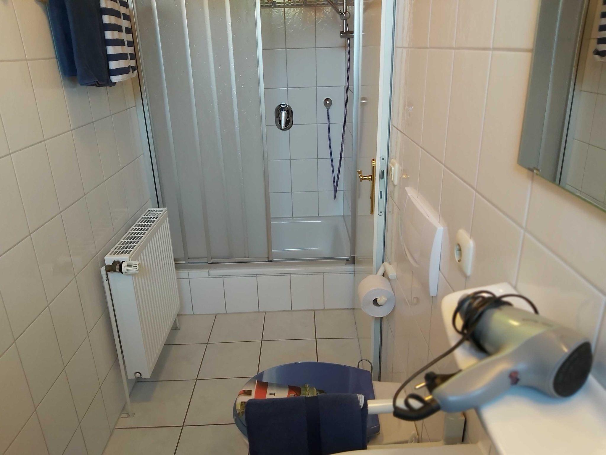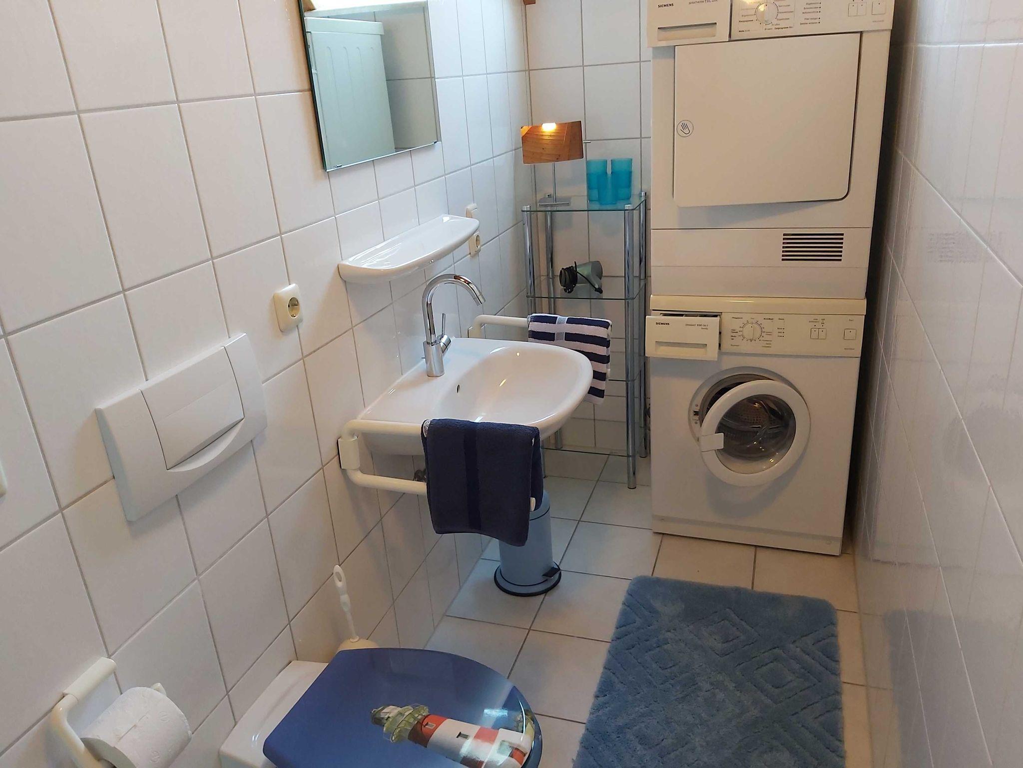 Ein Gäste-WC befindet sich im Erdgeschoss und das Dusch Bad mit WC im 1. Stock. Dieses verfügt über eine Waschmaschine, einen Wäschetrockner, Fön und Kosmetikspiegel sowie eine Fußmatte.