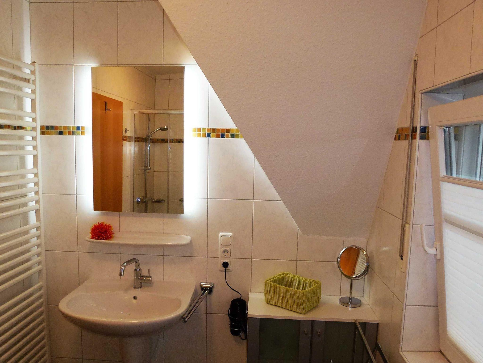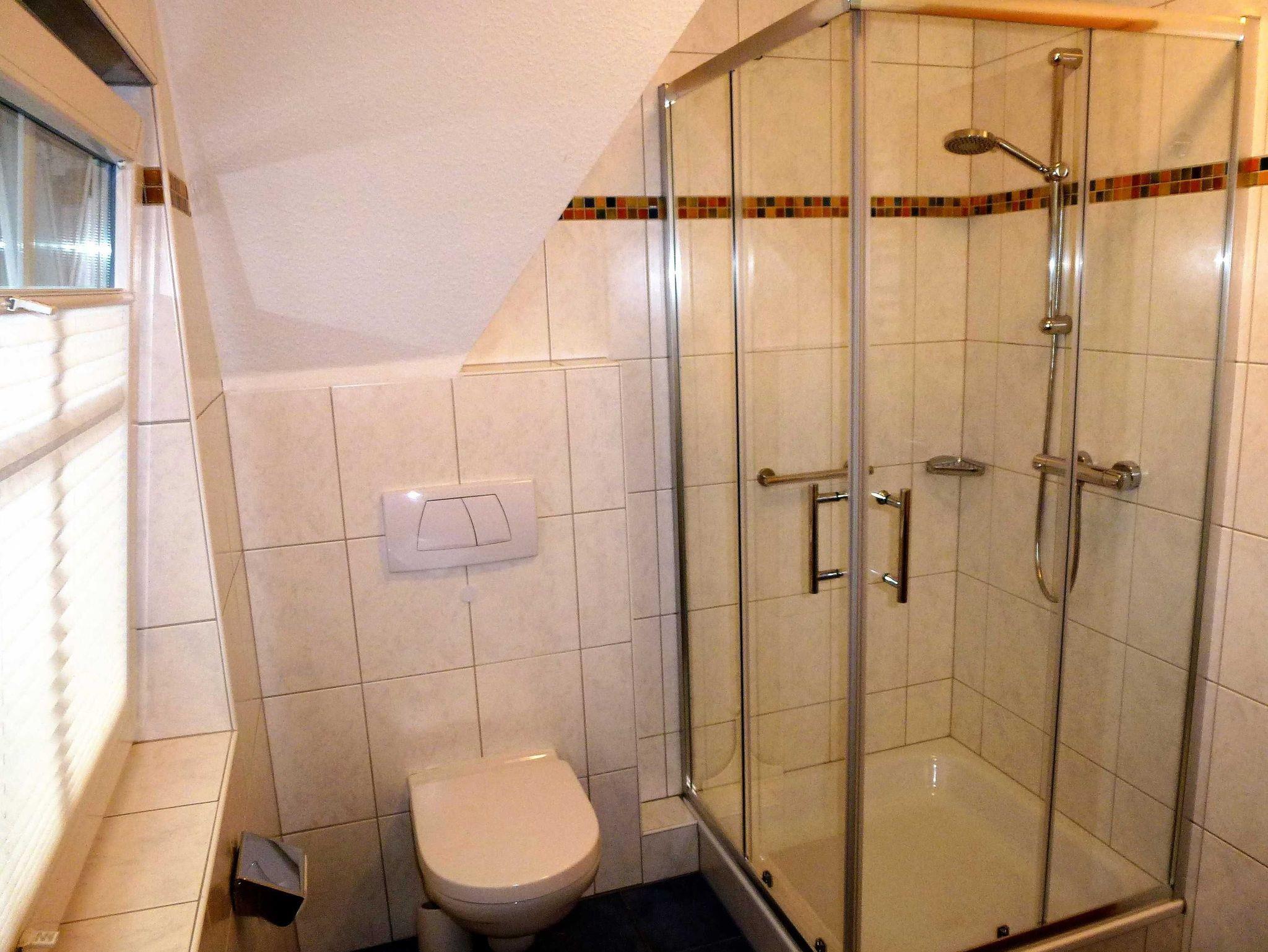 Das Badezimmer ist mit einer modernen Dusche und einem WC ausgestattet. Zusätzlich zum Heizkörper ist eine Fußbodenheizung vorhanden. Der Raum lässt sich über ein großes Fenster mit Sichtschutz und Insektenschutzgitter lüften. Darüber hinaus steht im Erdgeschoss ein separates Gäste-WC zur Verfügung.