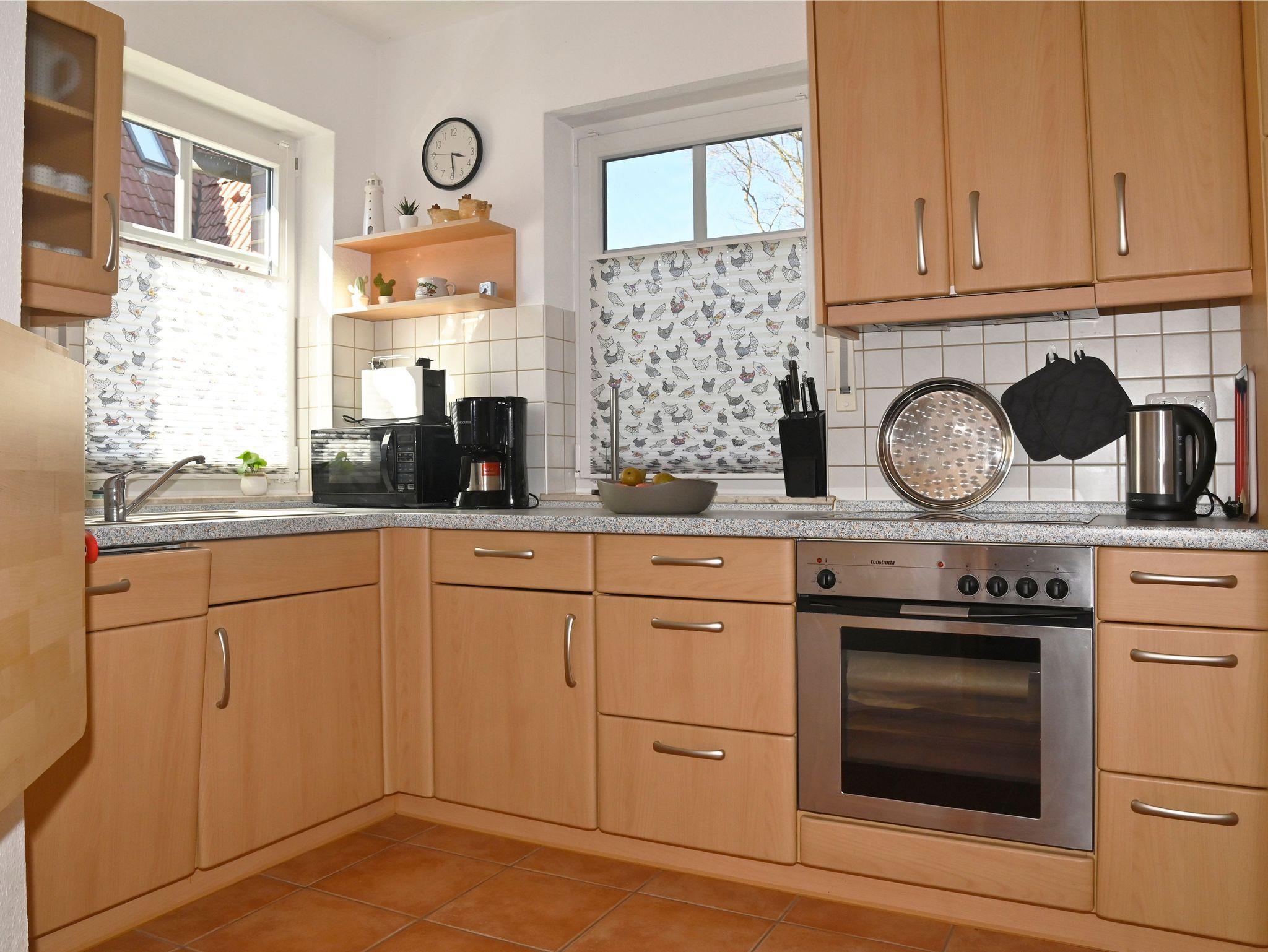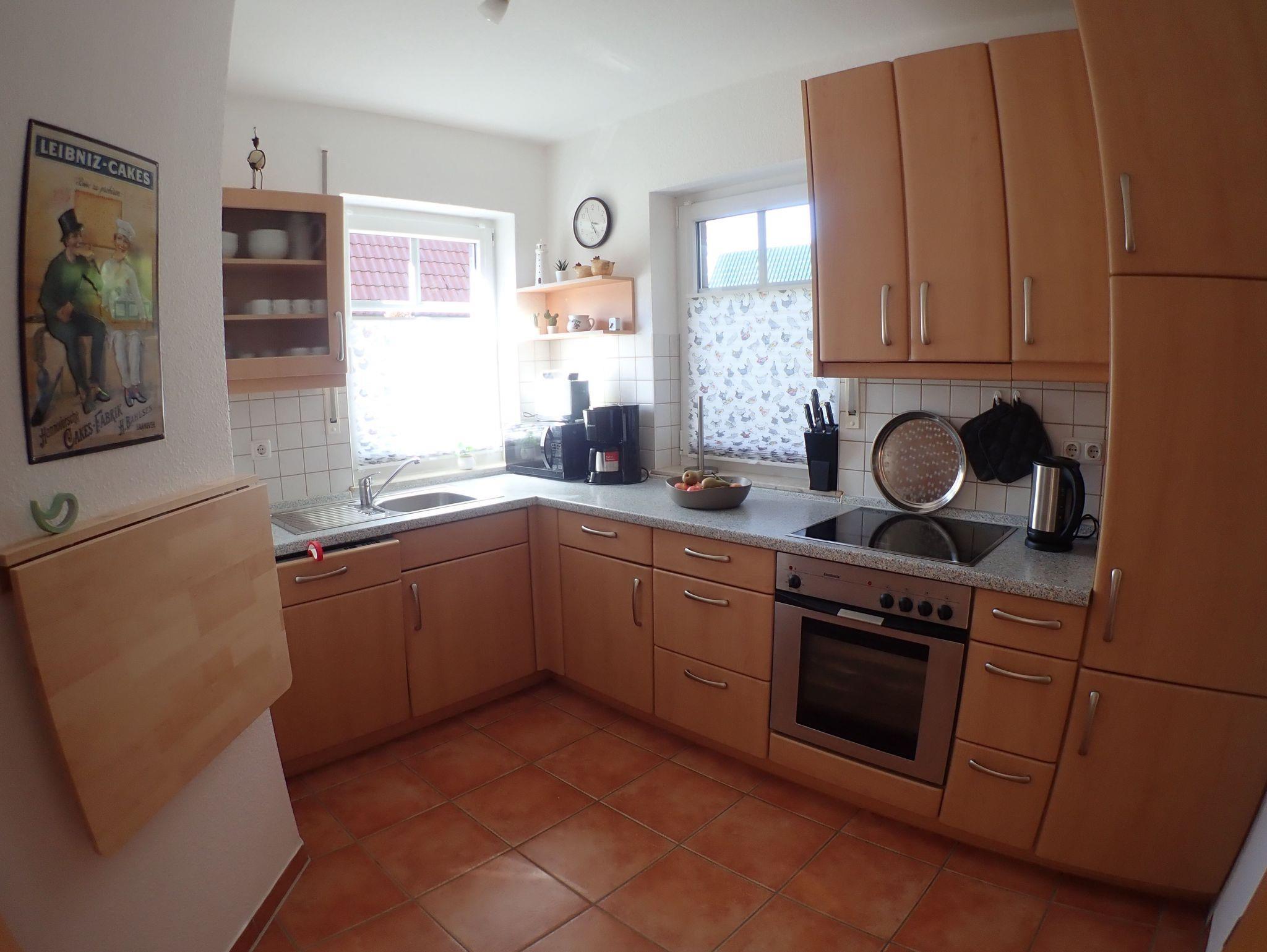 Die separate Küche ist sehr gut ausgestattet. Dazu gehört neben dem 12-teiligen Geschirr (Friesland-Porzellan) und Besteck eine moderne Küchenzeile. Die Ausstattung umfasst: - Spülmaschine - Kühlschrank mit Gefrierfach - Mikrowelle - Elektroherd mit Ceranfeld, Backofen und Dunstabzug - Kaffeemaschine, Toaster, Wasserkocher und Eierkocher - Edelstahltöpfe und Pfannen Im Hauswirtschaftsraum neben der Küche befinden sich die Heizungsanlage und - Waschmaschine, Wäsche-Trockner (Abluft) - Staubsauger - Bügeleisen, Bügelbrett - Kinderhochstuhl