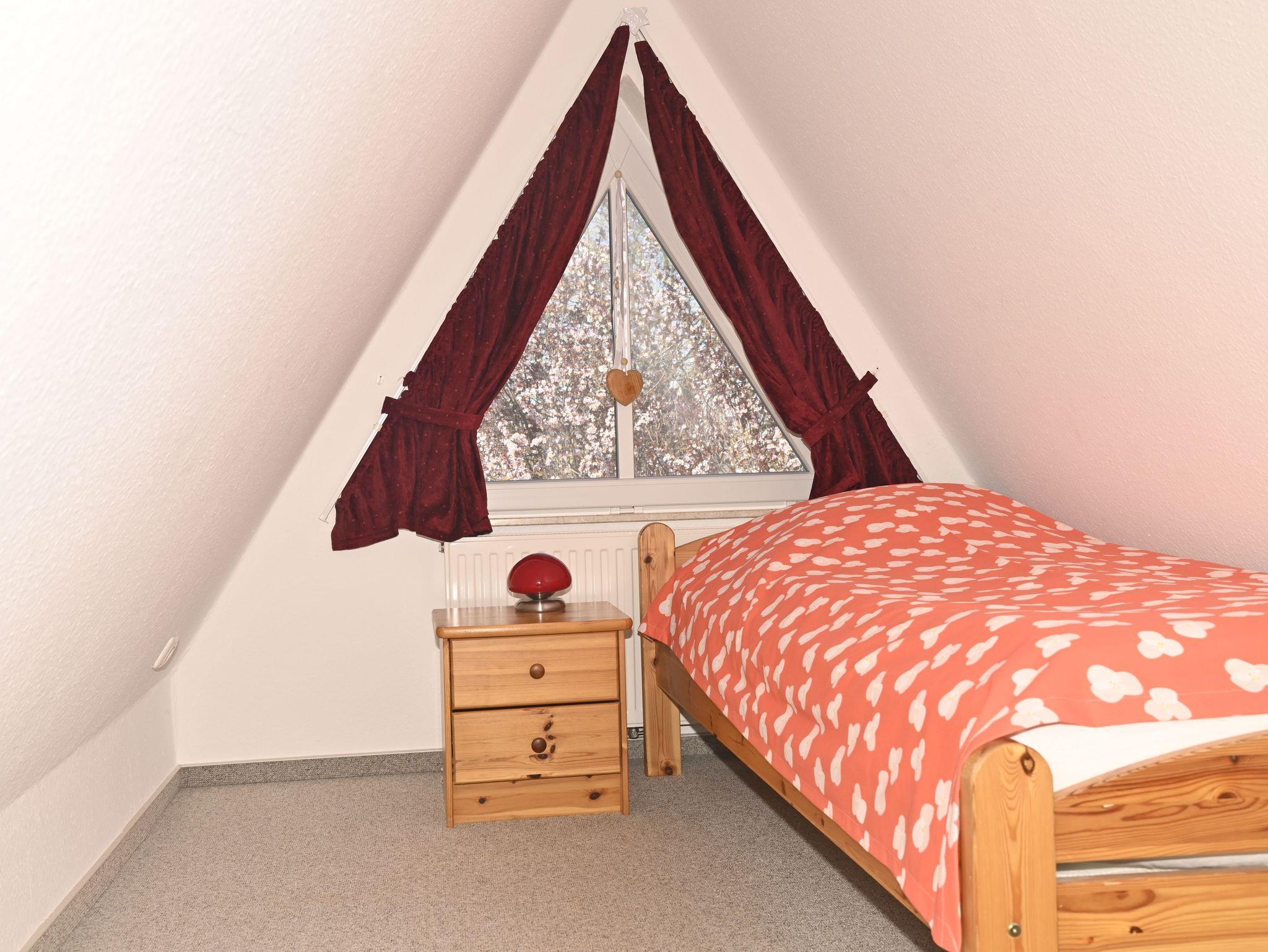 Der dritte Schlafraum im Dachgeschoss Es stehen zwei vollwertige Einzelbetten zur Verfügung. Der Raum ist mit zwei Kippfenstern ausgerüstet, eines davon verfügt über Insektenschutzgitter.
